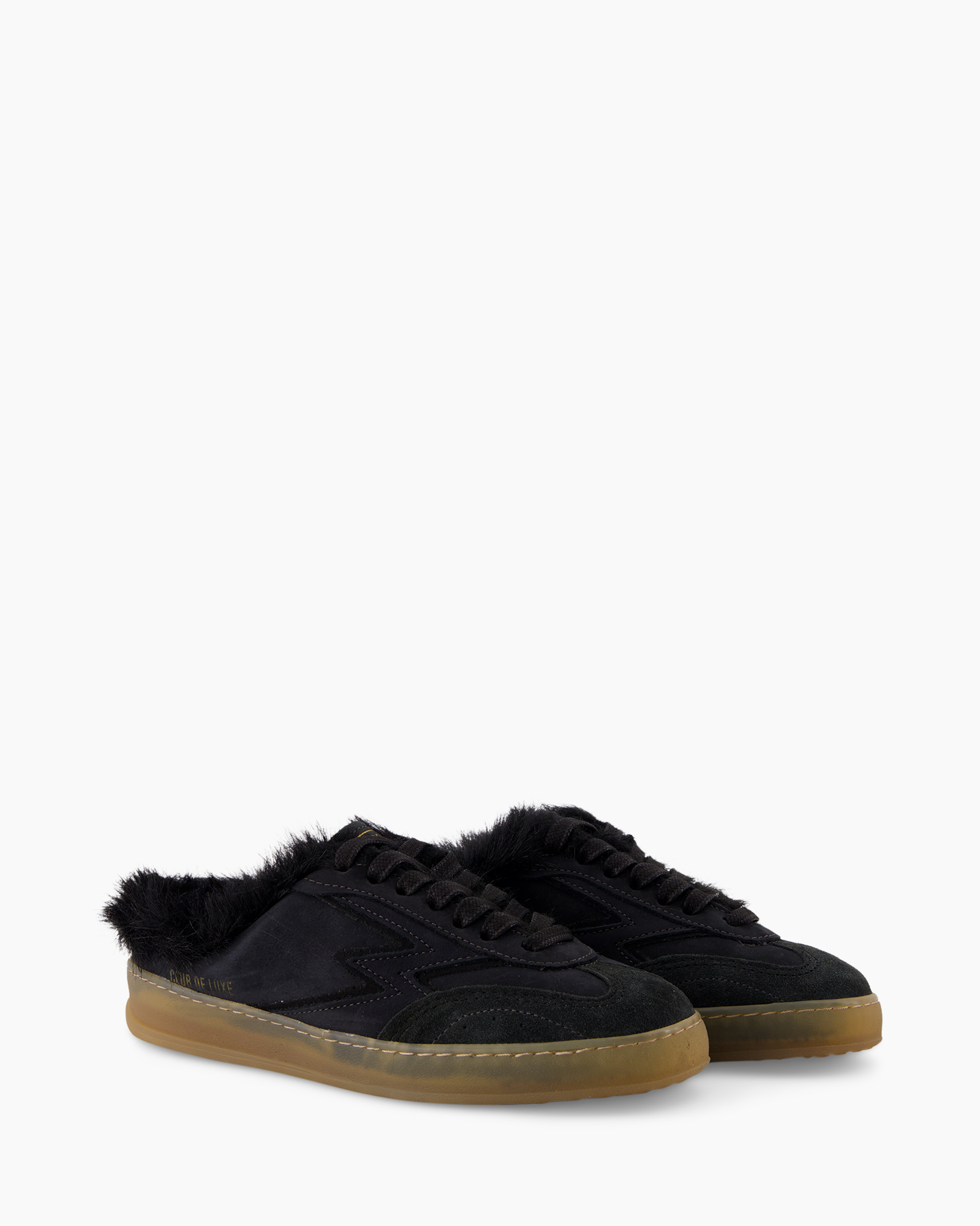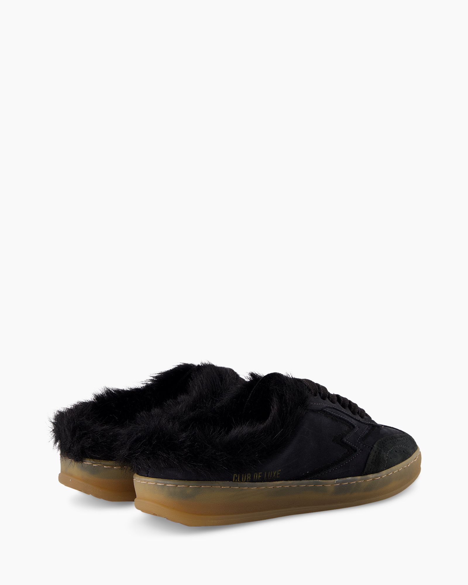Met de Sneaker Club Mule Deluxe Faux Fur Donker Bruin van Moaconcept stap je een wereld binnen waar comfort en een opvallende look samenkomen. Deze unieke mule sneaker, uitgevoerd in een diepe zwarte tint, trekt direct de aandacht. Je ziet zachte faux fur aan de binnen- en bovenrand, wat een verrassende draai geeft. De zwarte veters bieden een goede aansluiting, terwijl de robuuste zool in een warme rubberkleur contrasteert. Op de zijkant prijkt duidelijk het opschrift 'CLUB DE LUXE' en een bliksemschicht print, die deze schoen zijn kenmerkende uitstraling geven.