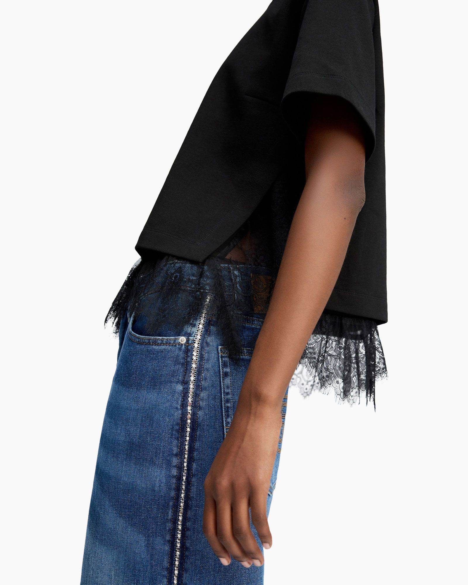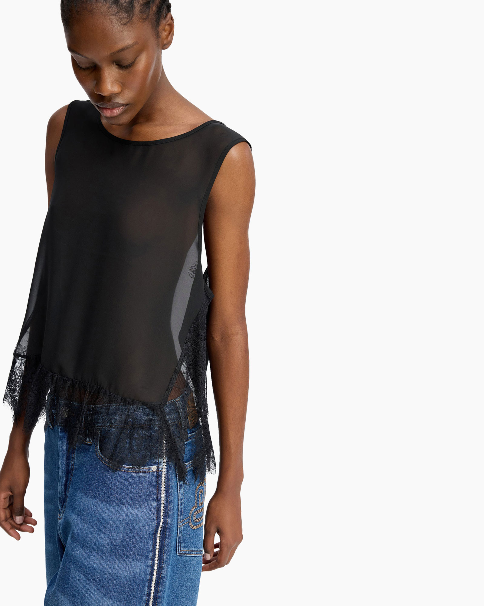Blouse Rach Zwart van Munthe is een opvallend kledingstuk dat je garderobe direct verrijkt. Deze zwarte blouse heeft een wijde pasvorm en korte mouwen die ruim vallen. Je ziet een ronde hals en een rechte snit met hoge splitten aan de zijkant. Aan de onderkant zit een brede rand van kant die onder de stof uitkomt.