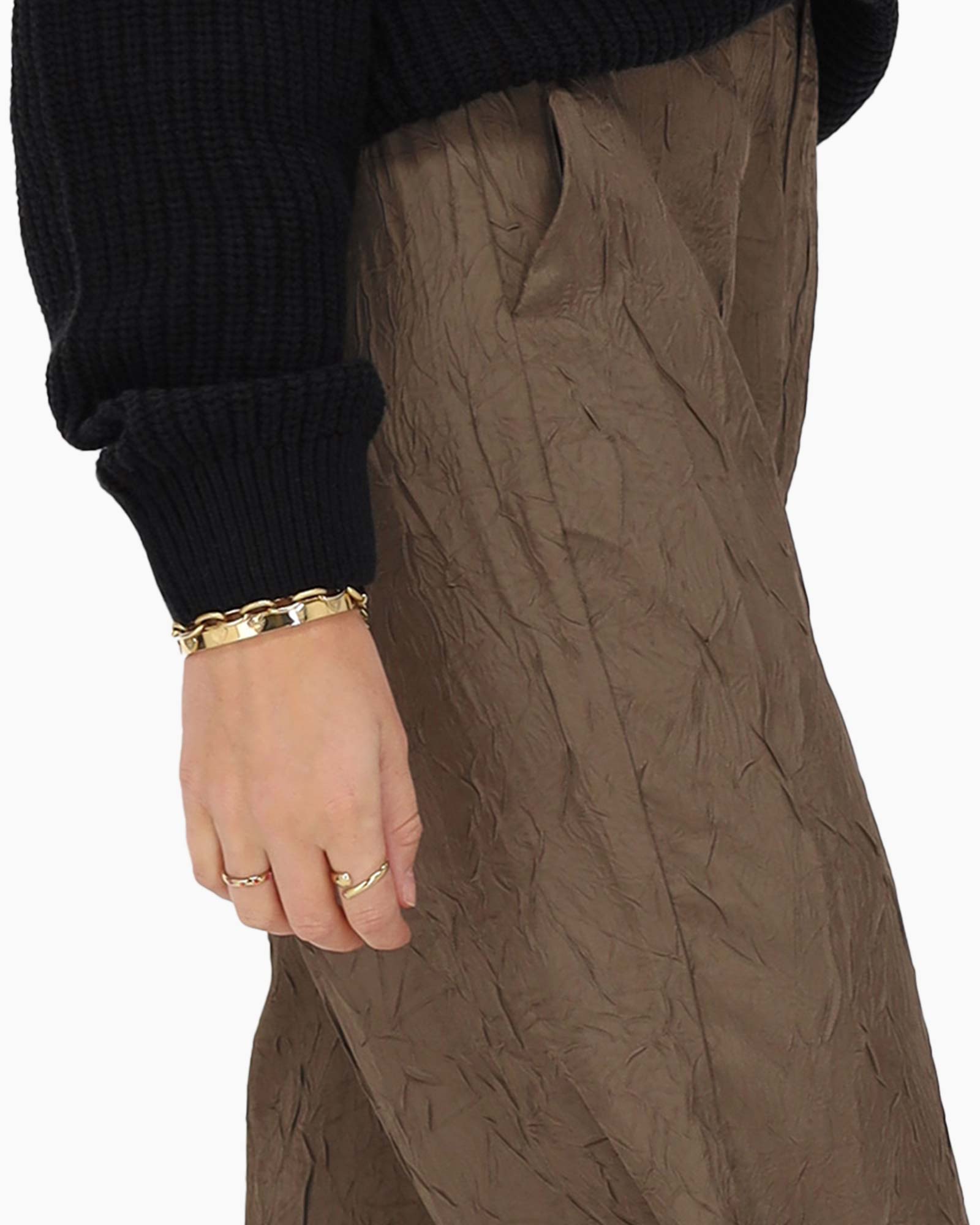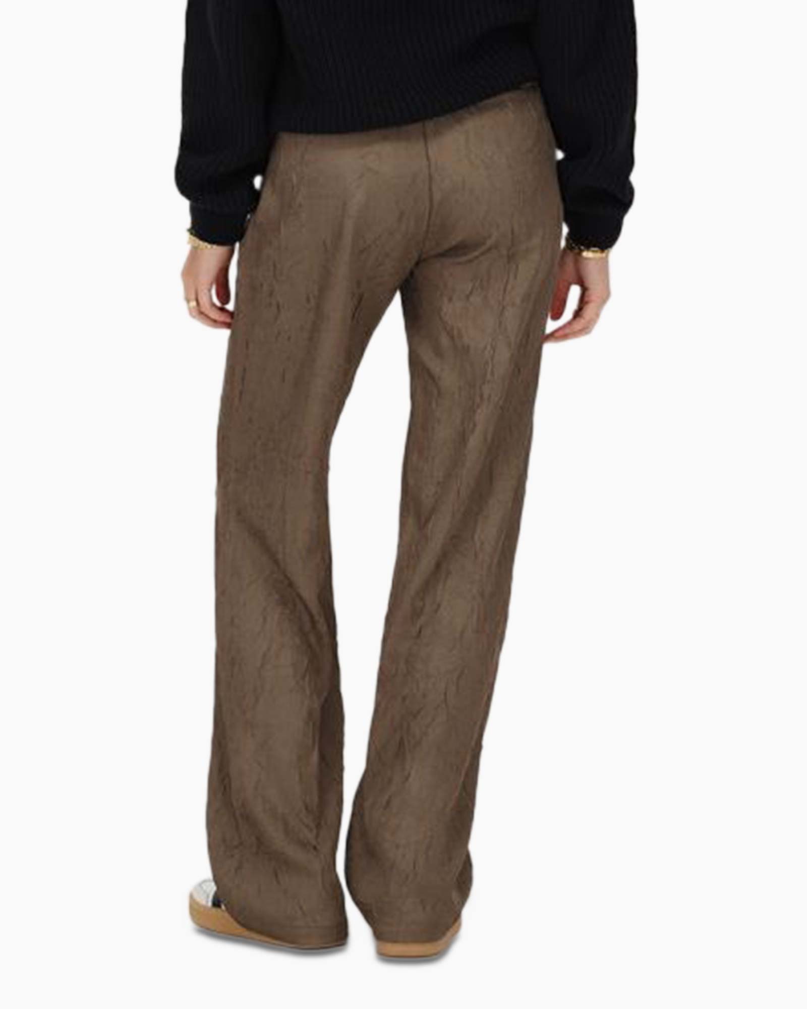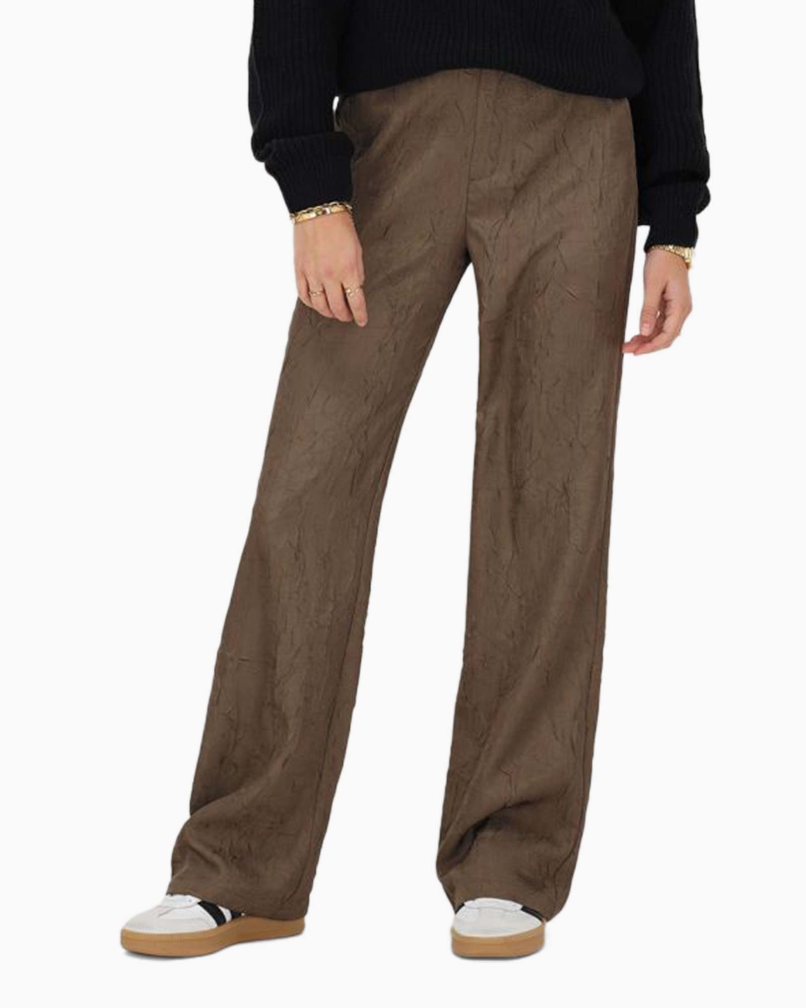 Geef je garderobe een instant upgrade met deze bruine textured broek van My Jewellery. De diepe bruine kleur en de subtiele crinkle finish geven je outfit direct die edgy feel waar je naar op zoek bent. Het is de perfecte mix tussen effortless comfort en high-fashion vibes. Styling tip: draag 'm met een oversized blazer voor een boss babe look of kies voor sneakers voor een casual vibe. Your style, your rules. Shop deze musthave bij Van Dijk en straal pure confidence uit!
