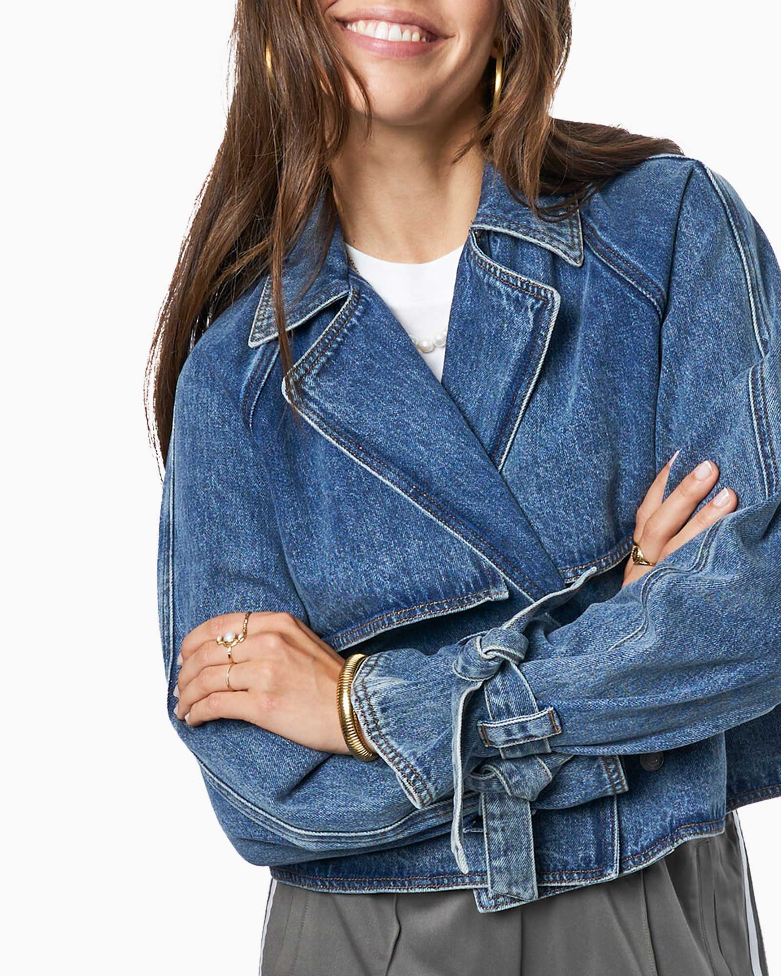 Geef je garderobe een instant upgrade met deze blauwe denim trenchcoat van My Jewellery. Dit cropped model combineert de klassieke details van een trenchcoat met een edgy denim feel. De statement gespen bij de mouwen en de stoere kraag zorgen voor die perfecte high-fashion look. Draag 'm met een wide leg pantalon voor een classy vibe of combineer met je favo sneakers voor de ultieme streetstyle. Ready to level up your spring fits? Scoor deze eyecatcher bij Van Dijk en own de straat!