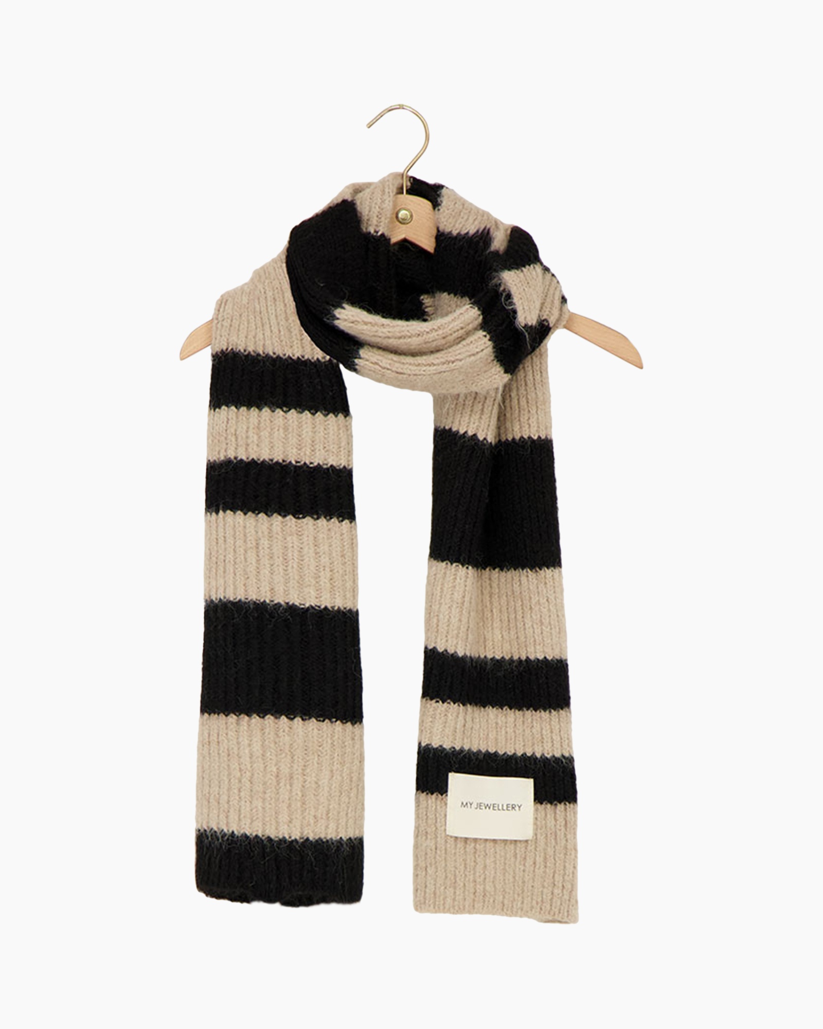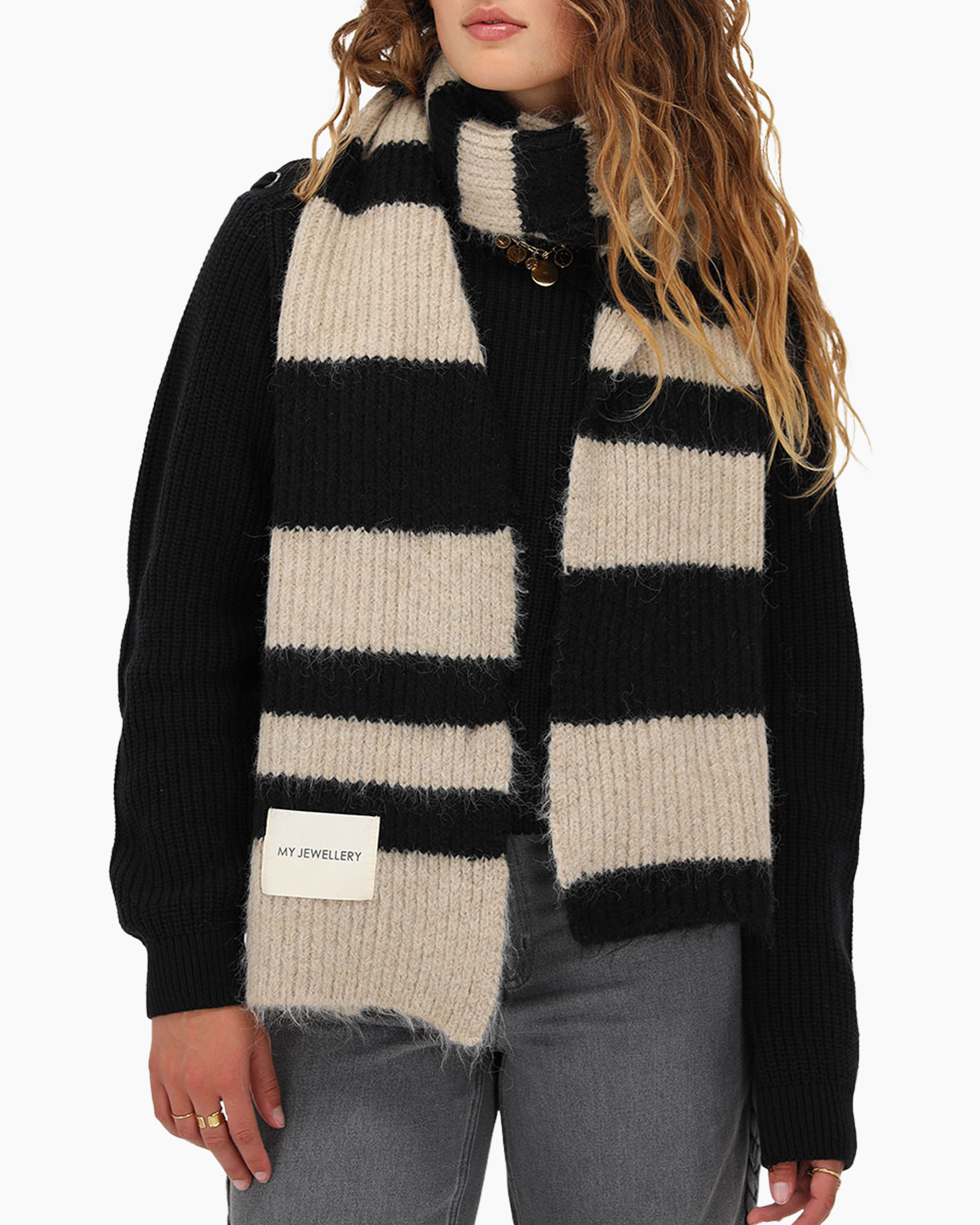 Wikkel jezelf in de ultieme winter vibes met deze beige en zwarte gestreepte sjaal van My Jewellery. Deze must-have geeft jouw look direct een fashion upgrade door de chunky ribgebreide structuur. Het opvallende witte label met de tekst "MY JEWELLERY" zorgt voor die herkenbare edgy feel. Draag 'm over een oversized jas voor een classy vibe of combineer de sjaal met een leather jacket voor een stoere twist. Maak je klaar om te shinen! Shop yours now!
