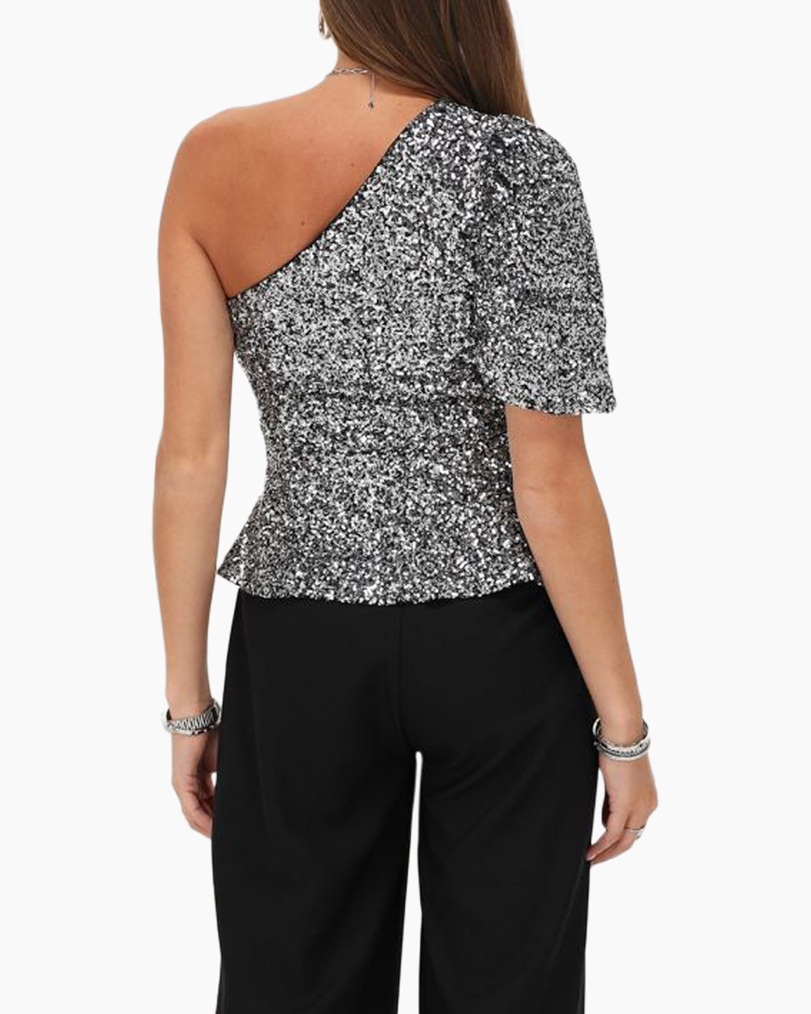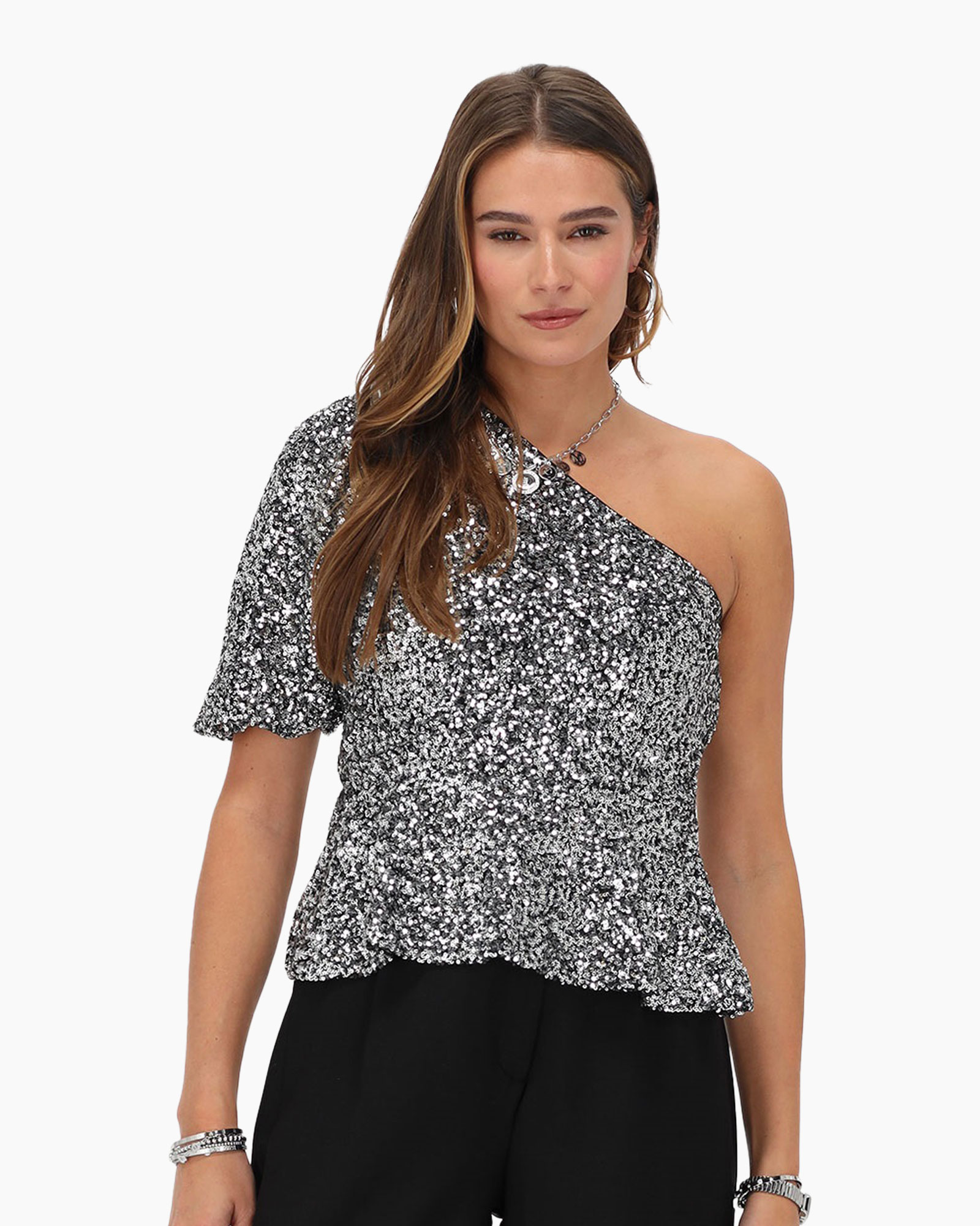 Ready to shine? Deze zilveren one-shoulder top van My Jewellery is de ultieme party essential voor jouw wardrobe. Met de all-over glimmende pailetten steel jij gegarandeerd de show tijdens elke night out. De asymmetrische fit geeft je look een edgy feel terwijl de sprankelende finish voor pure good vibes zorgt. Draag 'm met een leather look broek voor een stoere outfit of combineer met een pantalon voor een classy upgrade. This is your time to sparkle!