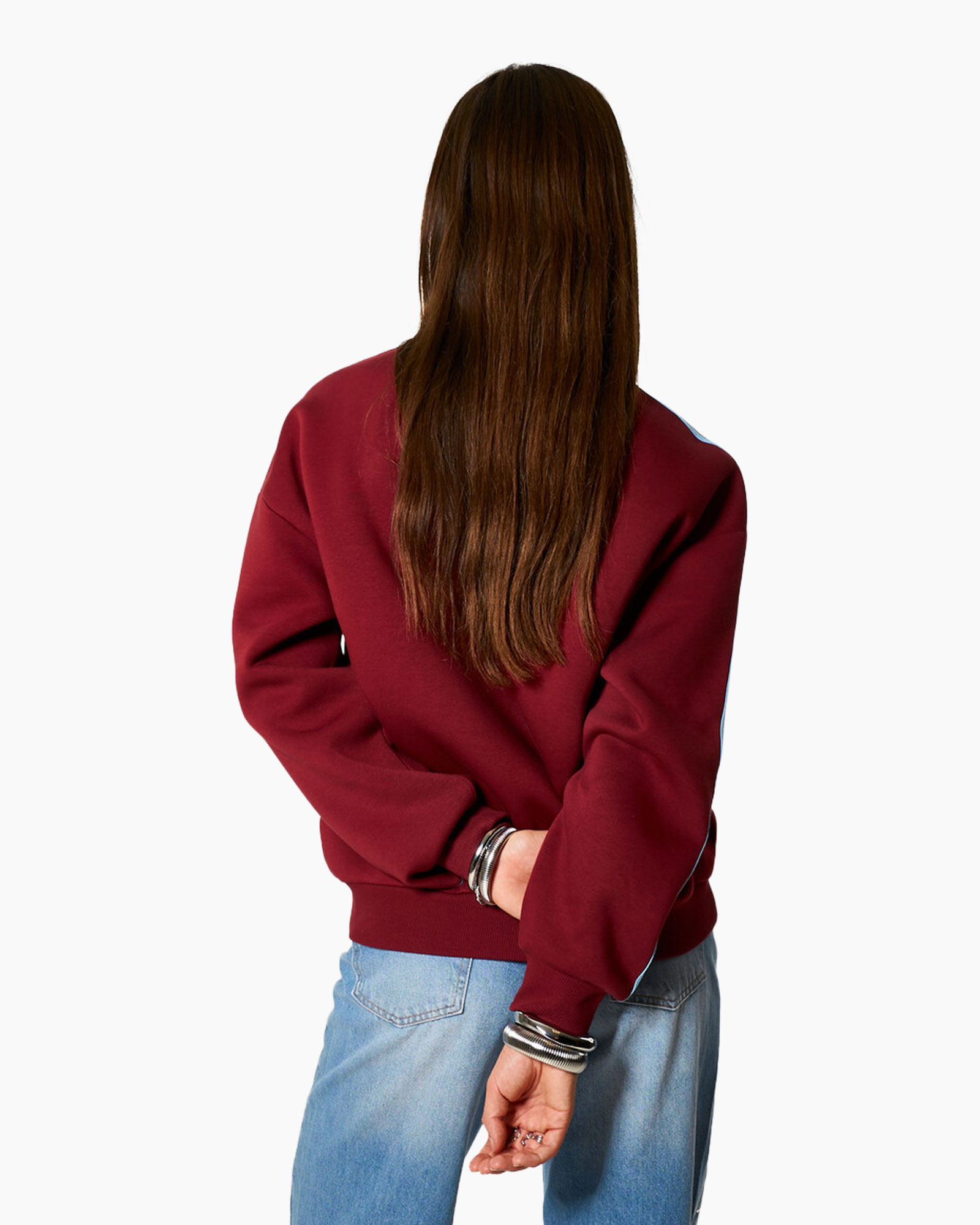 Trui Rue Des Rosiers Sporty Sweater With donker rood van My Jewellery is precies de sweater die je zoekt voor een relaxte uitstraling. Deze trui heeft een comfortabele, ruimvallende pasvorm en komt in een dieprode kleur die direct de aandacht trekt. De opvallende dubbele lichtblauwe strepen op de lange mouwen geven het item een sportieve draai. Je ziet een klassieke ronde hals en zowel de mouwen als de onderkant zijn afgewerkt met een brede, stevige boord.