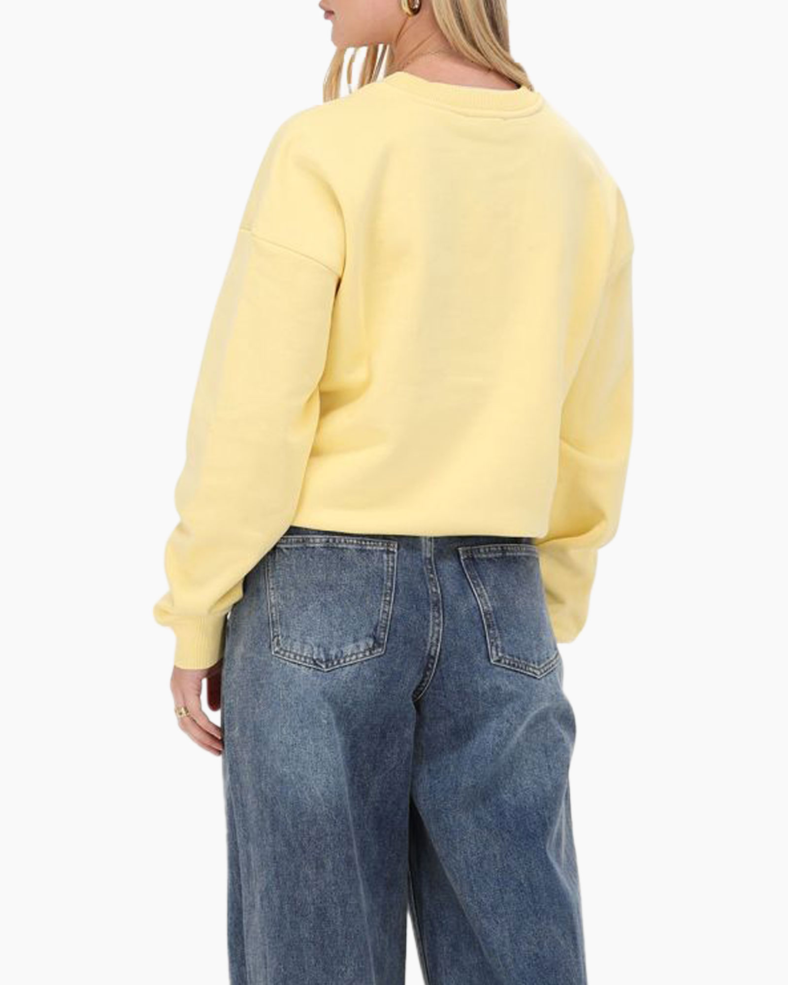 Straal de hele dag in deze gele oversized sweater! De sweater heeft een zachte gele kleur waardoor hij je look gelijk een kleuren boost geeft, we love it. Daarnaast zorgt de blauwe opdruk voor een stoere trendy look. Combineer de sweater op een wijde blauwe jeans gecombineerd met een paar stoere sneakers voor een all day comfy fit.