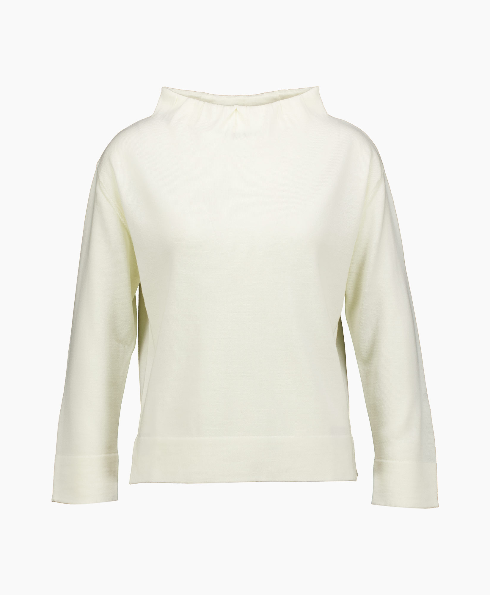 De Top Many-merinos1 Ecru van Natan is een verfijnde top met een rechte pasvorm die je direct een verzorgde uitstraling geeft. De lichte, crèmekleurige tint voegt warmte toe aan je kledingkast. Je ziet dat de hoge, opstaande kraag het silhouet definieert, terwijl de mouwen eindigen in een brede manchet. De afwerking aan de onderzijde heeft bovendien een korte split aan beide zijkanten.