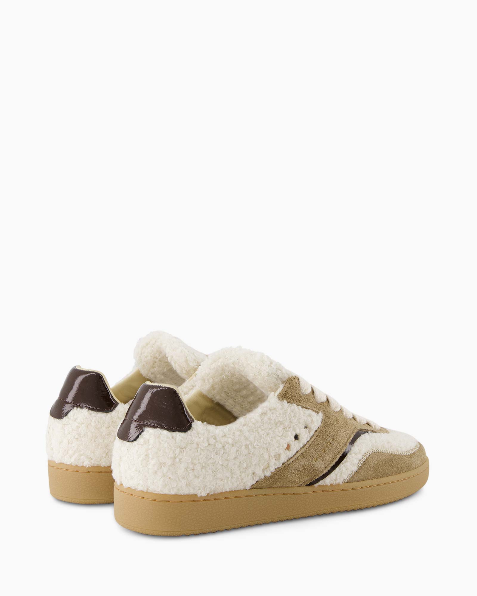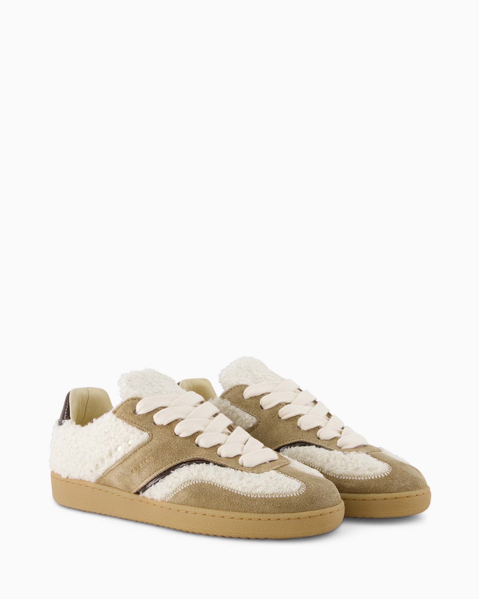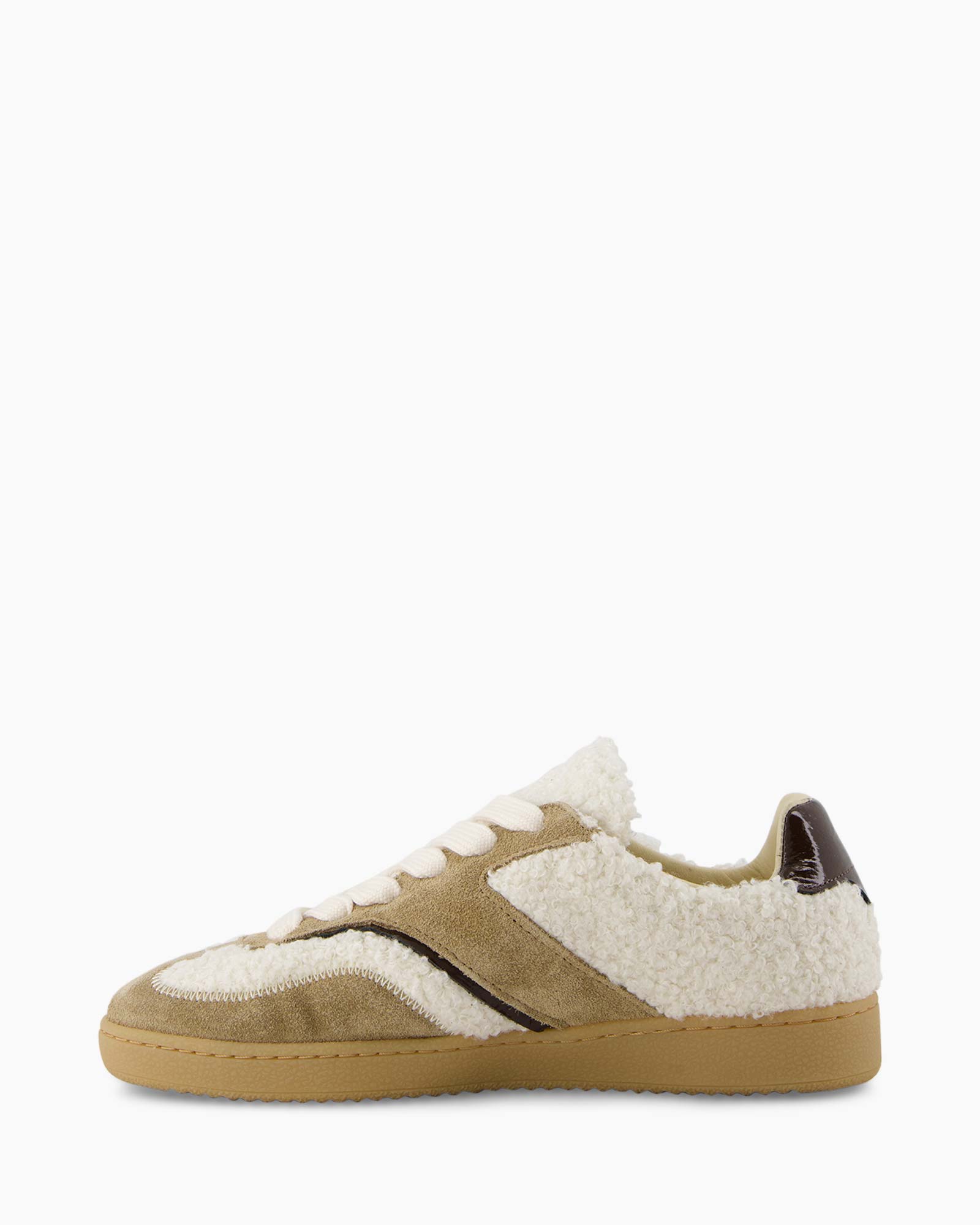 Maak kennis met de Sneaker Ray Owen Studs Taupe van Nubikk, een paar sneakers dat opvalt door zijn bijzondere combinatie van materialen en kleuren. Je ziet direct de zachte crèmekleurige teddy stof die een groot deel van de zijkanten bedekt. Dit is perfect gecombineerd met warme taupekleurige suède delen aan de voorkant, rond de veters en op de zijkanten. De crèmekleurige veters knopen de schoen dicht en passen goed bij de lichte stof.