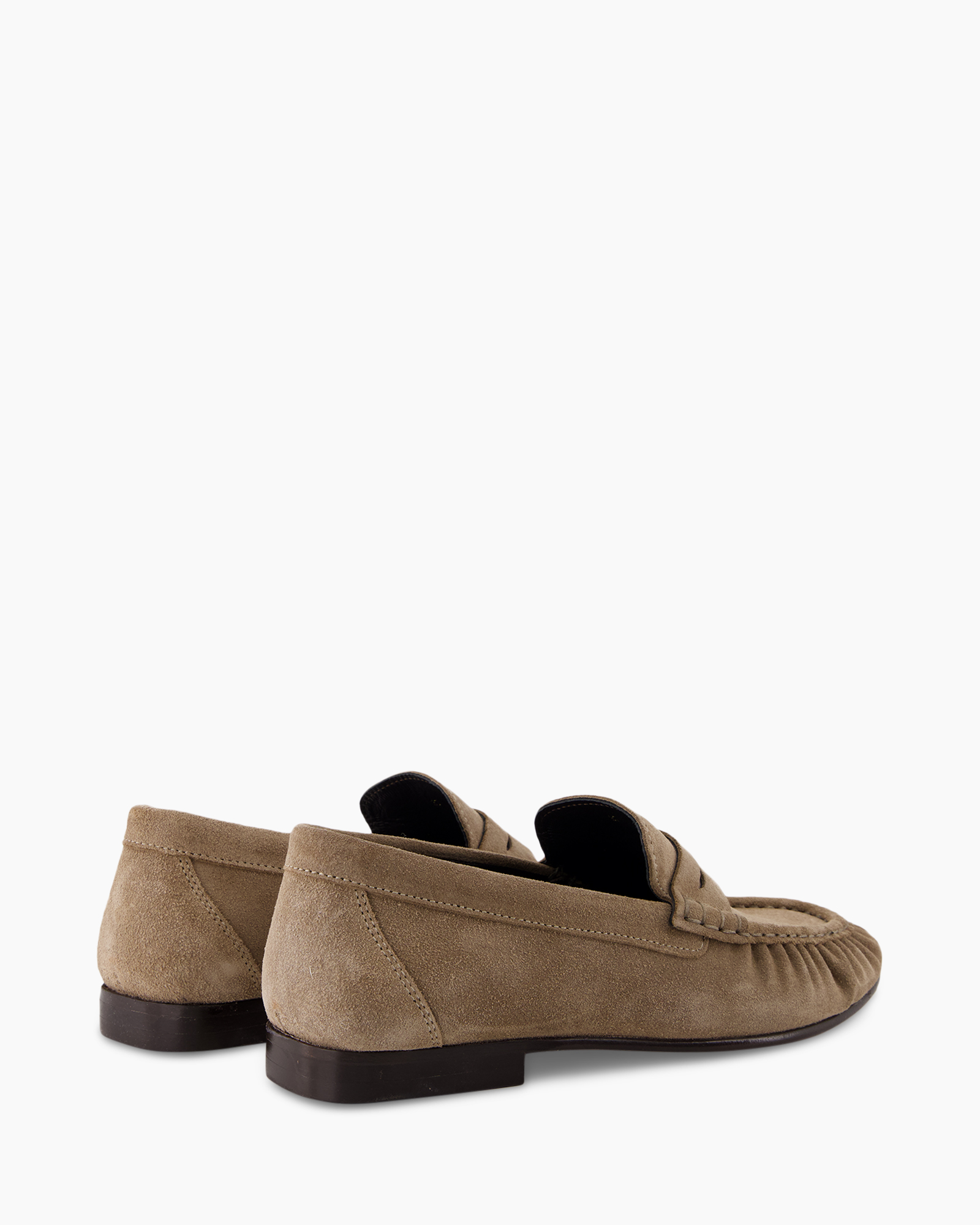 Voor een waardevolle toevoeging aan je schoenencollectie zie je hier de Loafer Penny Wrinkle Grijs van Posa. Deze loafer biedt je een comfortabele basis, geschikt voor uiteenlopende gelegenheden. Je herkent de loafer aan zijn zachte, suède-achtige afwerking in een veelzijdige grijze tint die neigt naar zandkleur. Deze kleur maakt de schoen goed combineerbaar met veel items uit jouw garderobe. Vooraan zie je het gerimpelde detail op de neus, een kenmerk dat direct opvalt. Over de wreef loopt de klassieke penny strap, een subtiel element dat de schoen een afgemaakte uitstraling geeft. Stiksels langs de rand van de zool en over de moc-toe accentueren de ambachtelijke afwerking. Je draagt deze loafer gemakkelijk bij diverse activiteiten.