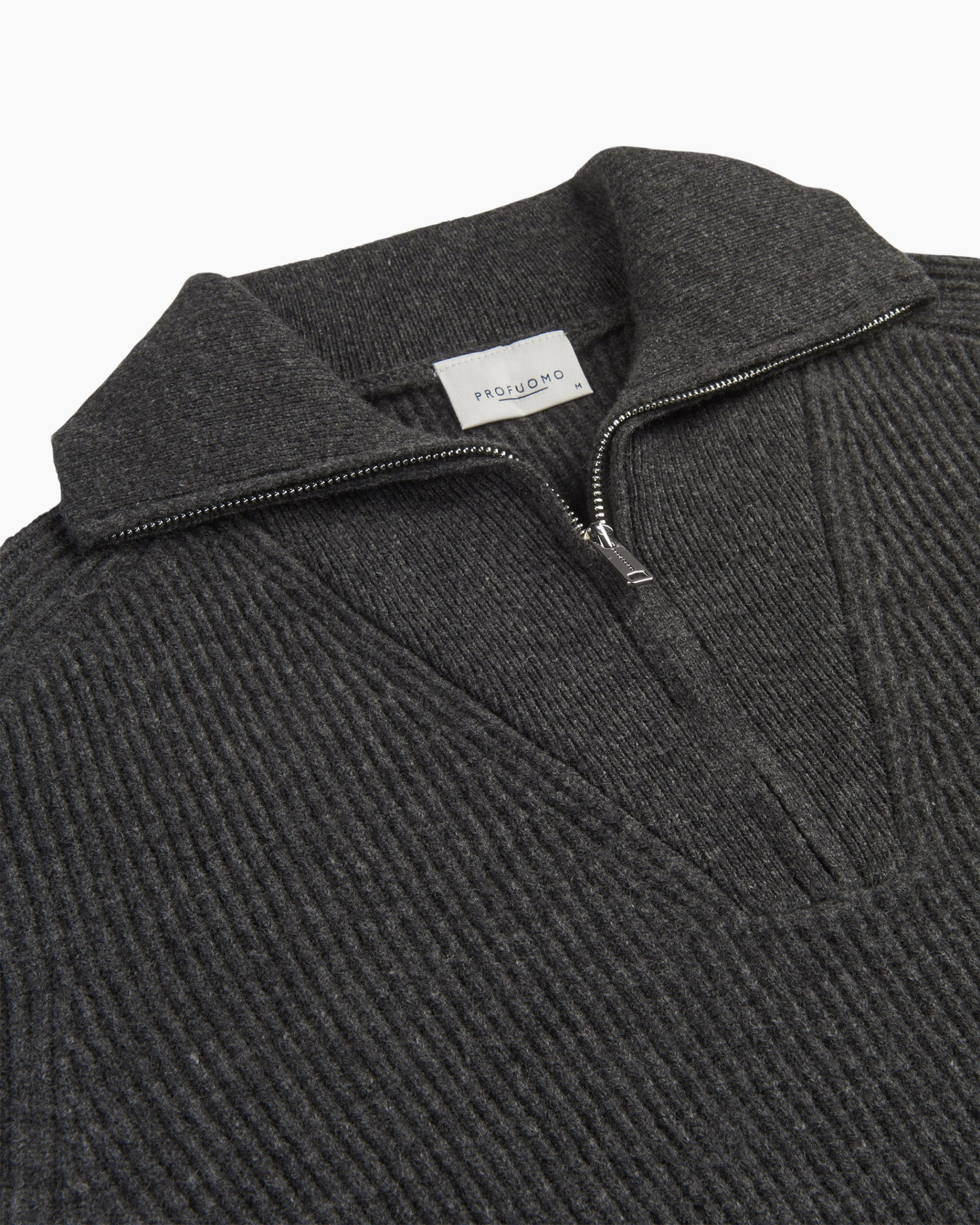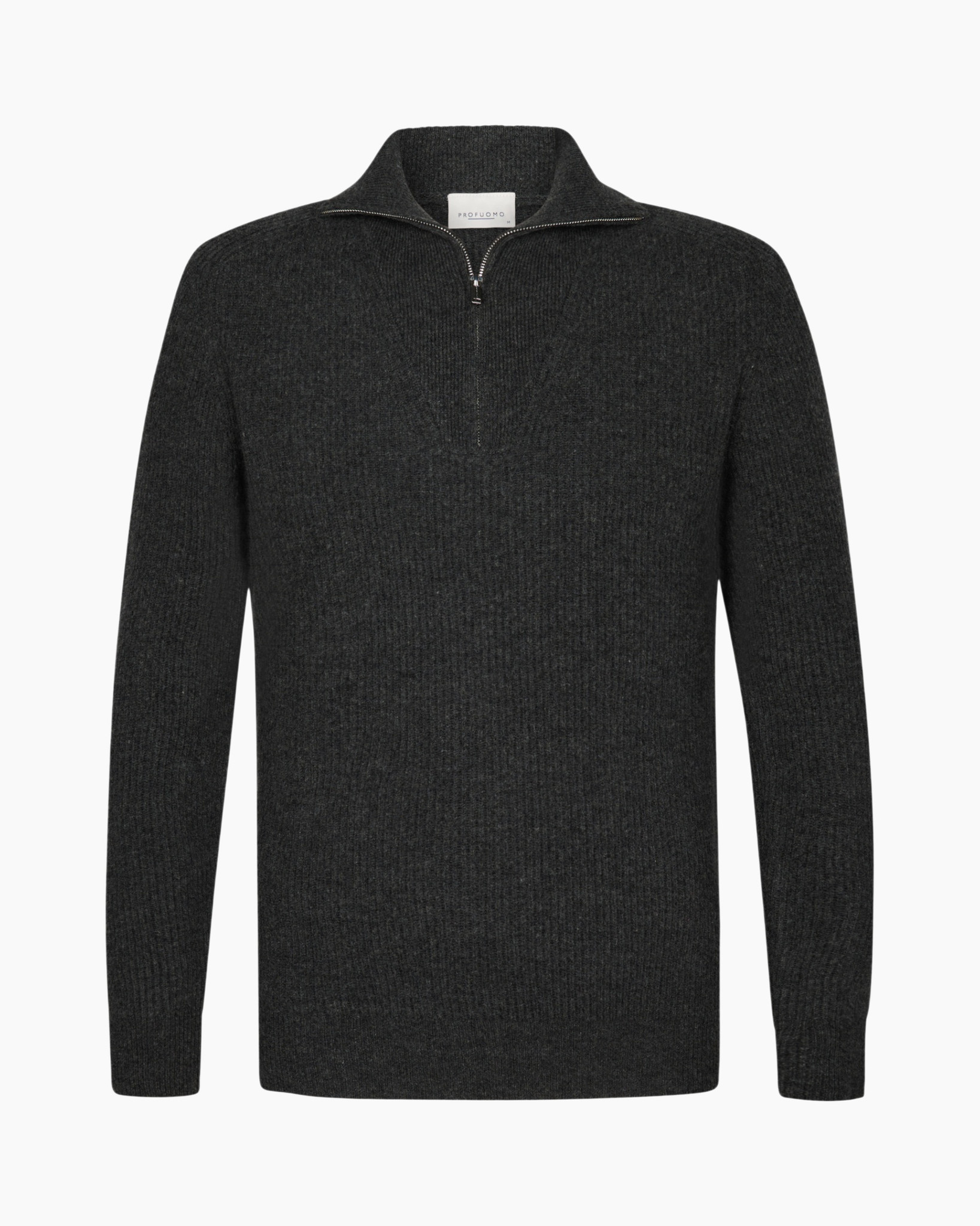 Deze Trui Half Zip Gre Grijs van Profuomo verrijkt je garderobe met een essentieel kledingstuk. Deze comfortabele trui valt op door zijn diepe, antracietgrijze kleur, een tint die je makkelijk combineert met diverse broeken en shirts. Je voelt direct de duidelijke ribstructuur die het materiaal zijn karakter geeft, zichtbaar over het hele lijf en de mouwen. De pasvorm is prettig ruim, waardoor de trui soepel om je lichaam valt en je volop bewegingsvrijheid ervaart. De halfrits, uitgevoerd in een subtiele zilverkleur, kun je open of dicht dragen. Zo varieer je eenvoudig met de opstaande kraag. De mouwen en de onderkant van de trui zijn voorzien van een nette ribboord. Dit zorgt voor een fijne afsluiting en een behouden vorm. Dit is een trui die je met plezier draagt, van je vrije tijd tot aan je werk.
