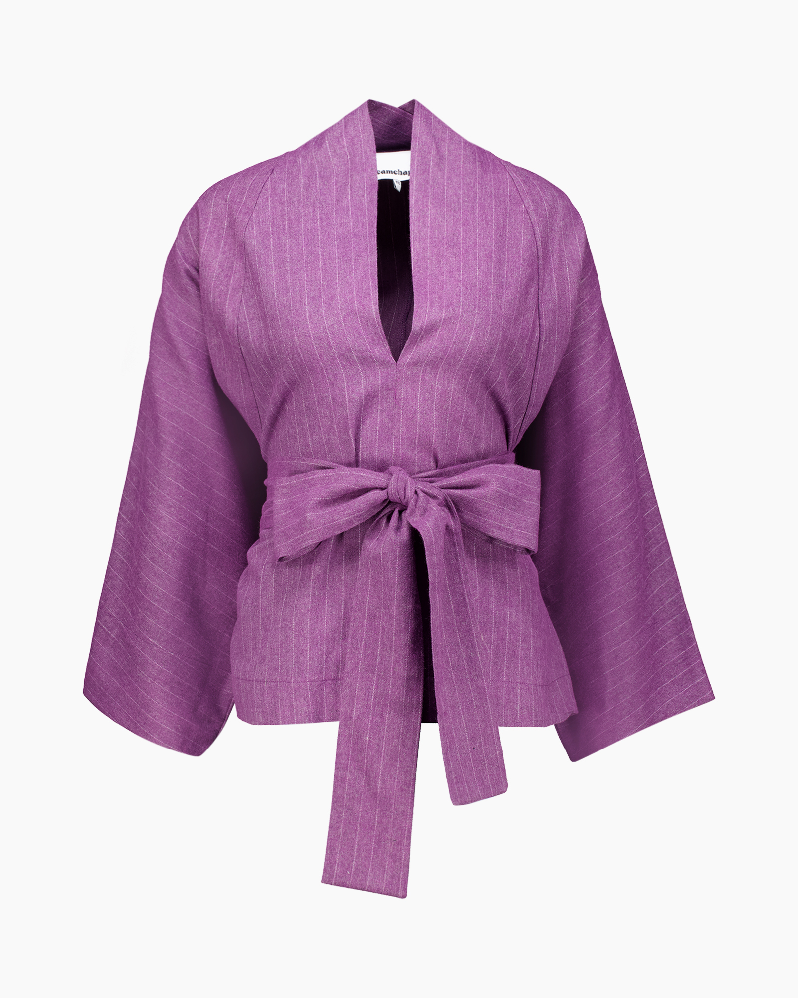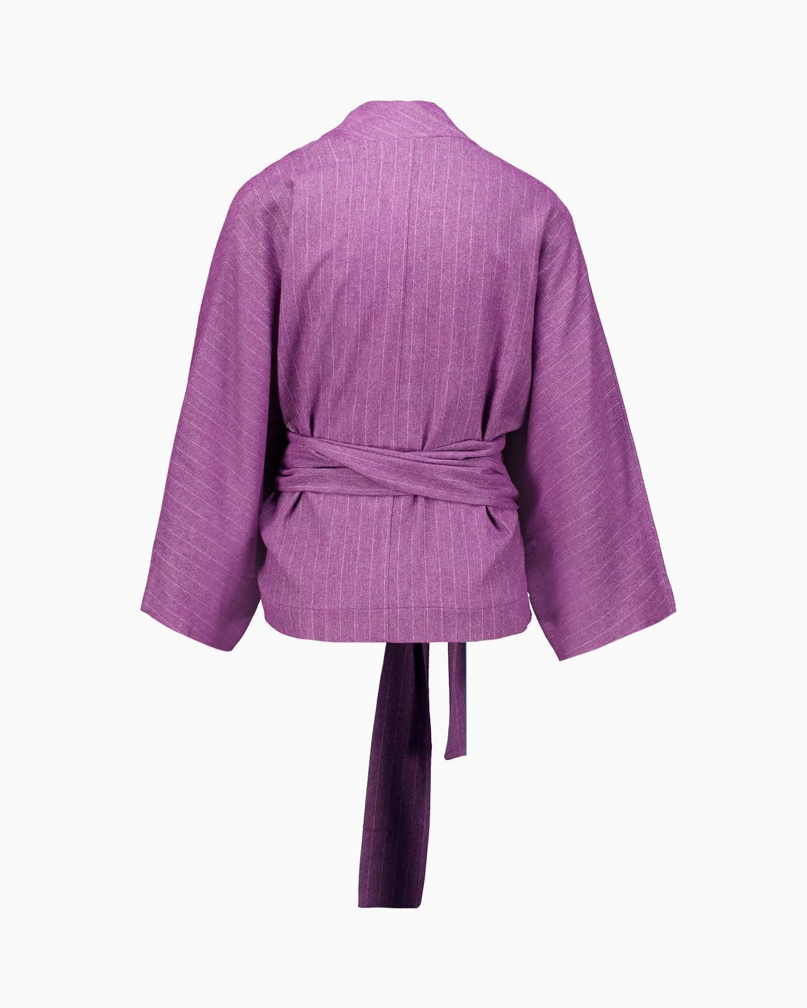 Dit korte wikkeljasje in een diepe paarse tint is een krachtig kledingstuk dat je garderobe verrijkt. Je ziet meteen de losvallende pasvorm, die je naar eigen inzicht vormgeeft met de bijgeleverde brede ceintuur. Dit item heeft een opvallende opstaande kraag en een diepe V-overslag zonder zichtbare sluitingen. Let op de ruime, aangeknipte mouwen die zorgen voor een comfortabele draagervaring.
