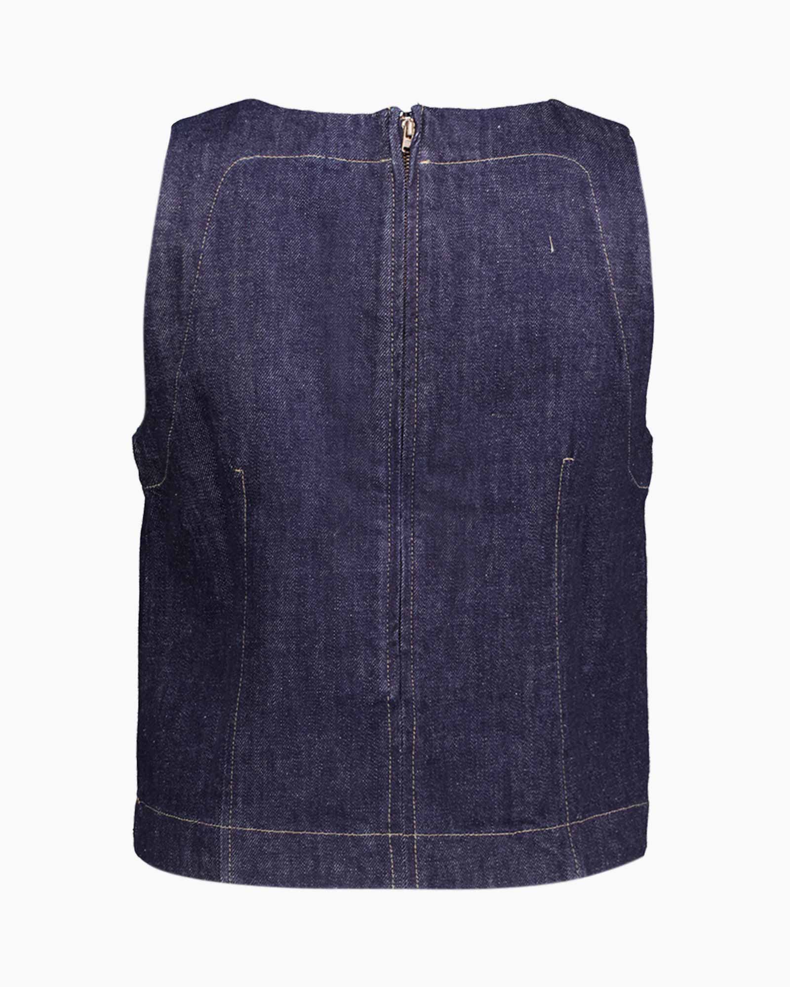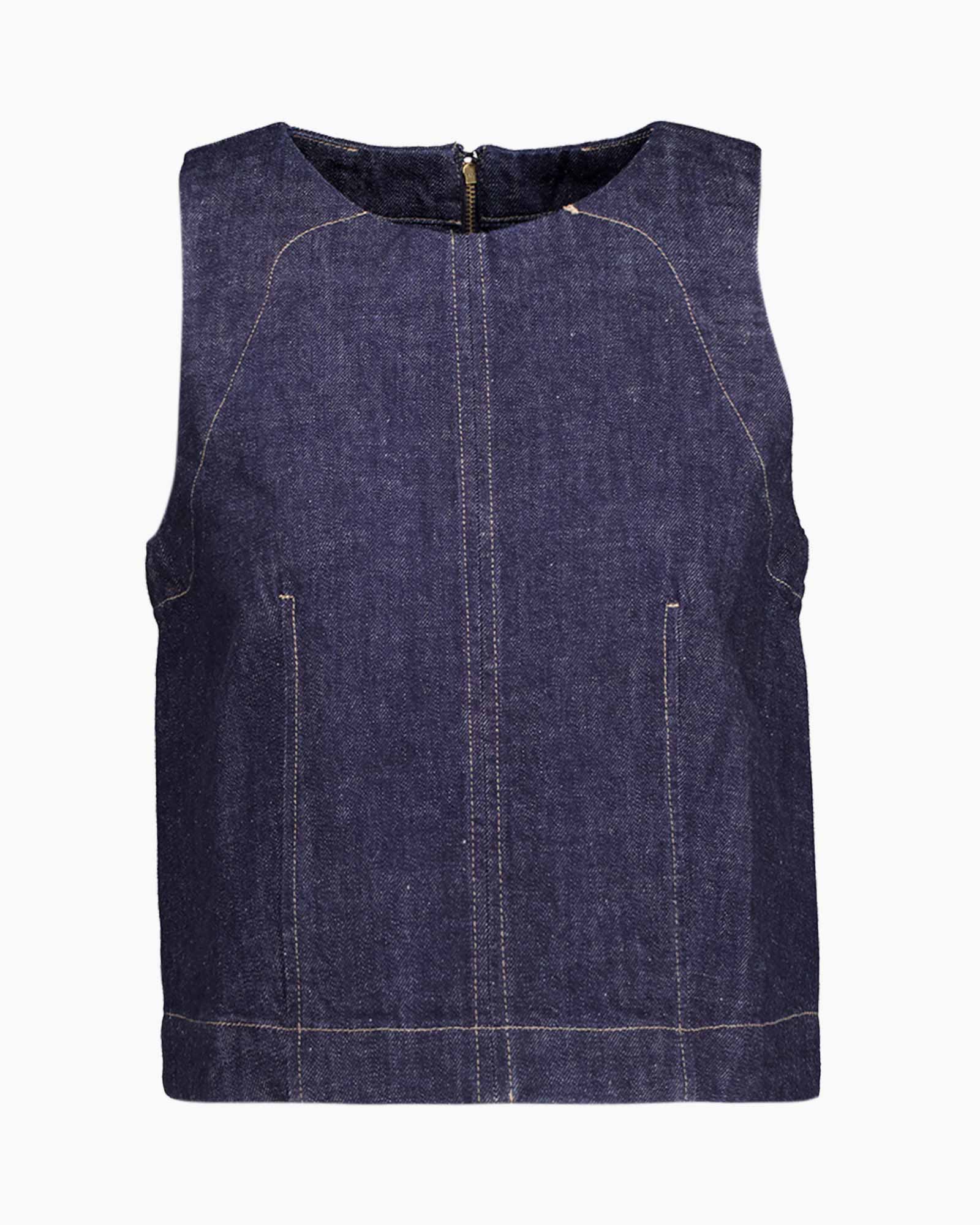 ELI is een cropped top van raw denim. De getailleerde snit en de soepele, biologisch katoenen stof zorgen voor veel bewegingsvrijheid. Contrasterende stiksels accentueren het silhouet en geven de look een retro touch. Een kenmerkend item dat de tand des tijds zal doorstaan.