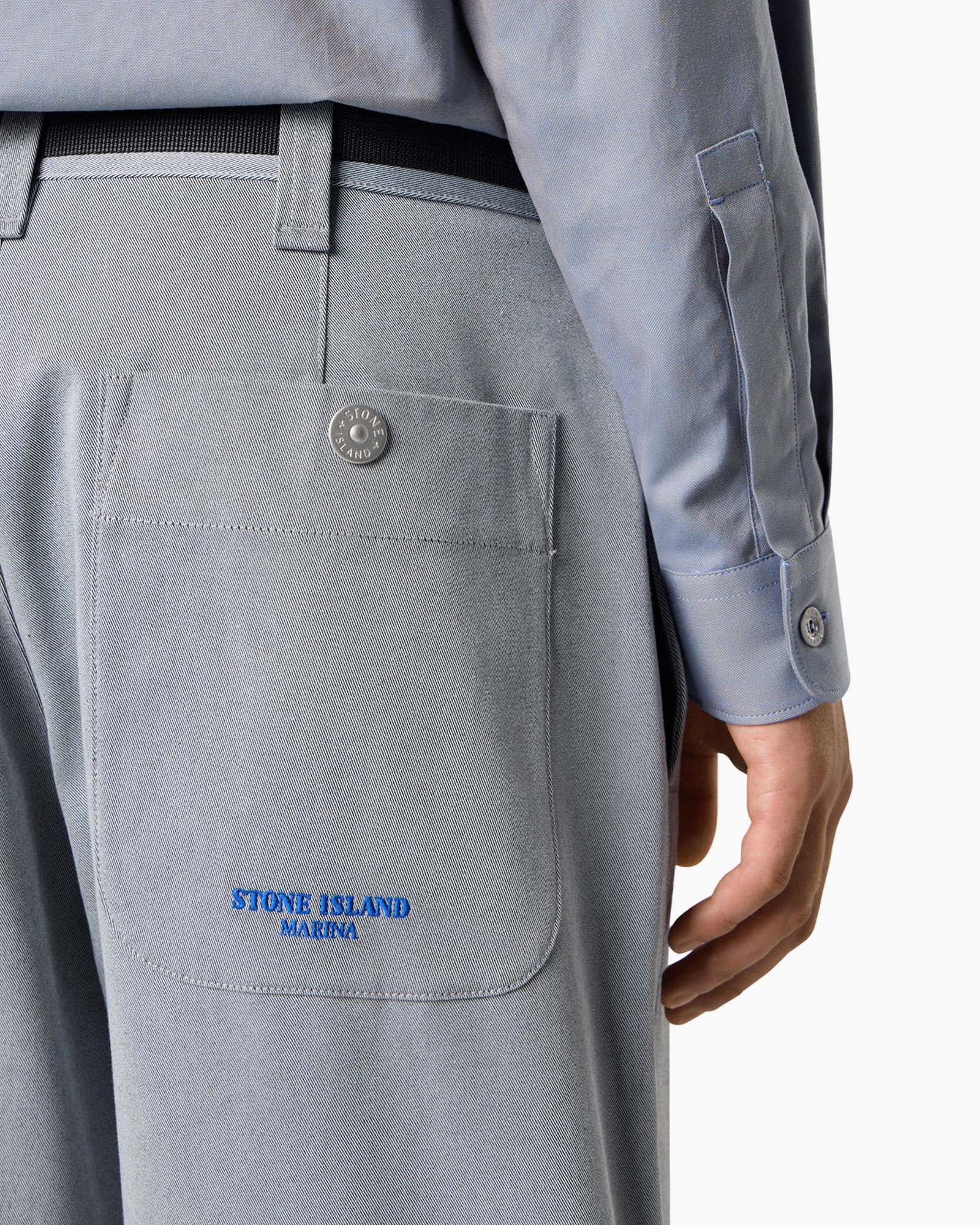 Breng direct structuur in je garderobe met de Cargobroek 3100015 S0x Blauw van Stone Island, een ruimvallende pantalon met een rechte pasvorm. Je ziet hier de broek in een heldere, lichtgrijze tint met een subtiele blauwe gloed. De voorkant heeft kenmerkende plooien en je krijgt er een contrasterende zwarte riem bij. Achterop vallen de grote, opgestikte zakken direct op, afgewerkt met metalen logoknopen voor een robuuste uitstraling.