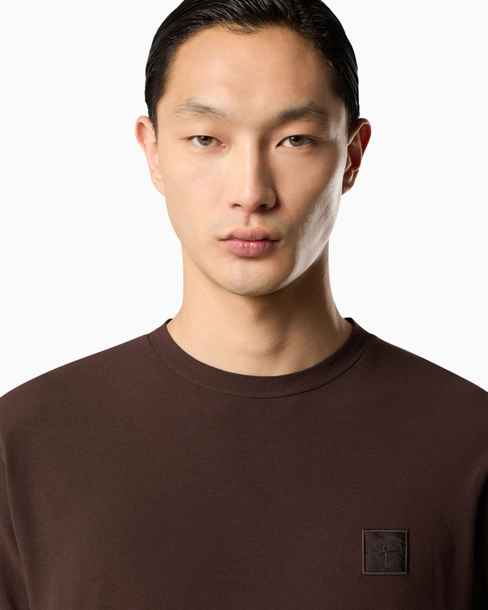 Je ziet hier het T-shirt Ghost Cotton Jersey Crepe Donker Bruin van Stone Island, een basisstuk dat direct opvalt door zijn rijke, diepe kleur. Dit T-shirt heeft een rechte pasvorm die comfortabel valt en de klassieke ronde halslijn zorgt voor een tijdloze uitstraling. Er zijn geen knopen of zakken aanwezig. Let op de ton-sur-ton badge op de borst; dit is een kenmerkend en subtiel detail.
