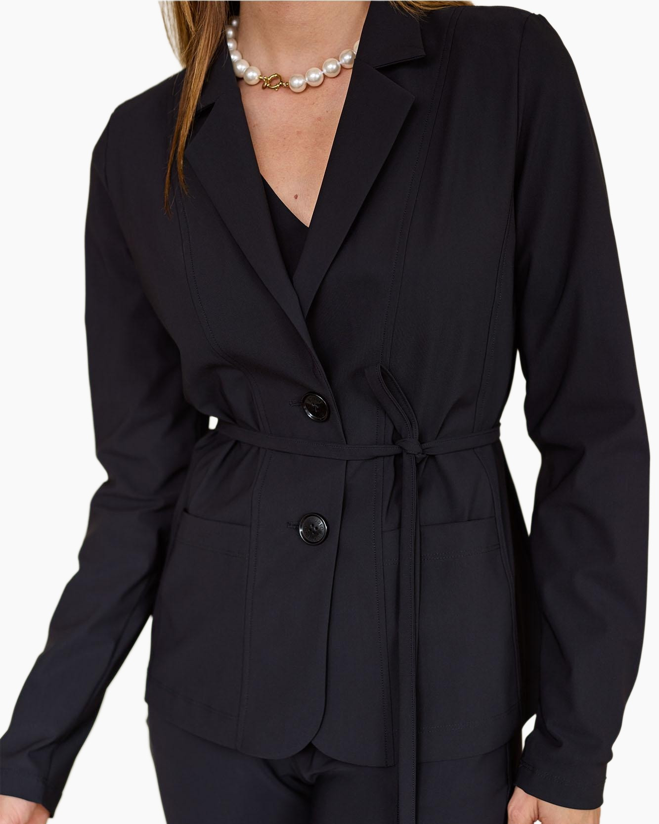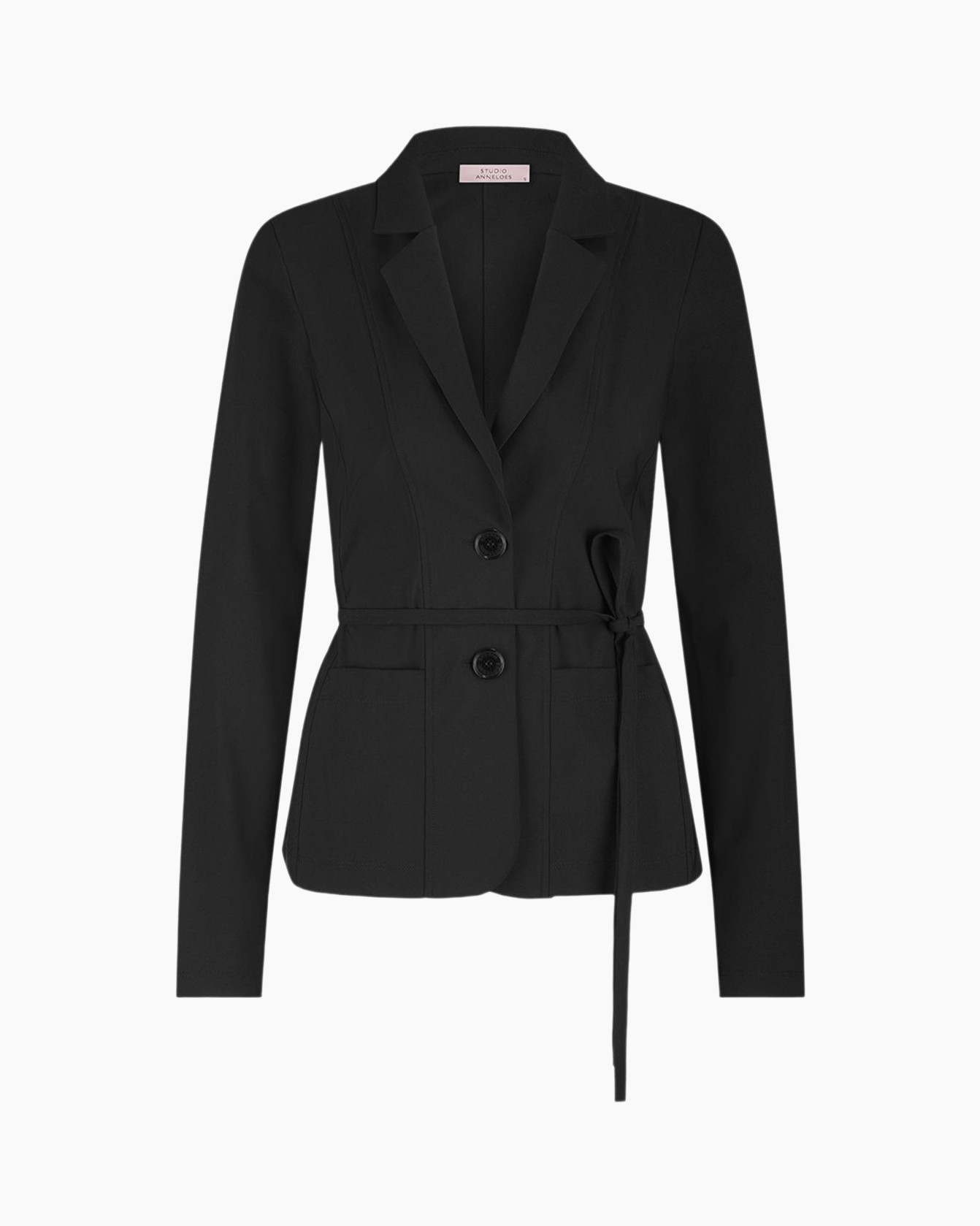 Blazer Clean Blazer Licht Grijs van Studio Anneloes laat je direct zien hoe een goede blazer het verschil maakt in je garderobe. Deze blazer, die je hier in een diepe zwarte kleur ziet, heeft een pasvorm die jouw figuur prachtig accentueert. De getailleerde snit volgt de lijnen van je lichaam, terwijl de lange mouwen netjes aansluiten. Een klassieke reverskraag siert de bovenkant en de voorkant sluit met twee donkere knopen. Met het strikceintuur, dat je zelf vastknoopt, pas je de taille precies aan zoals jij wilt. Dit creëert een flatterende lijn. Aan de voorkant vind je twee praktische opgestikte zakken. De verticale stiksels aan zowel de voor- als achterkant geven de blazer extra structuur en een verzorgde afwerking. Je merkt direct hoe prettig de stof aanvoelt en hoe goed de blazer met je meebeweegt. Hierdoor draag je hem comfortabel de hele dag door, bij diverse gelegenheden.