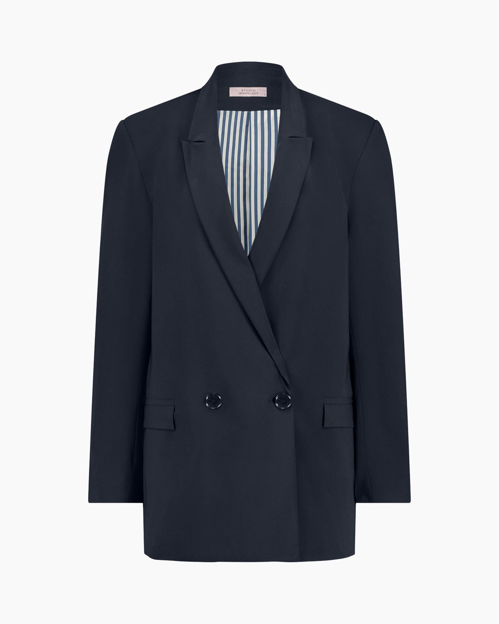 De Dokus blazer van Studio Anneloes in de elegante kleur Dark Blue combineert een trendy, oversized silhouet met klassieke details. Dit double-breasted jasje heeft een subtiele maar krachtige uitstraling dankzij de brede revers en opvallende knopen. De unieke voering met strepen geeft een speelse twist aan het geheel. Gemaakt van onze geliefde Medium Travelstof, blijft deze blazer de hele dag kreukvrij en biedt hij ultiem draagcomfort.