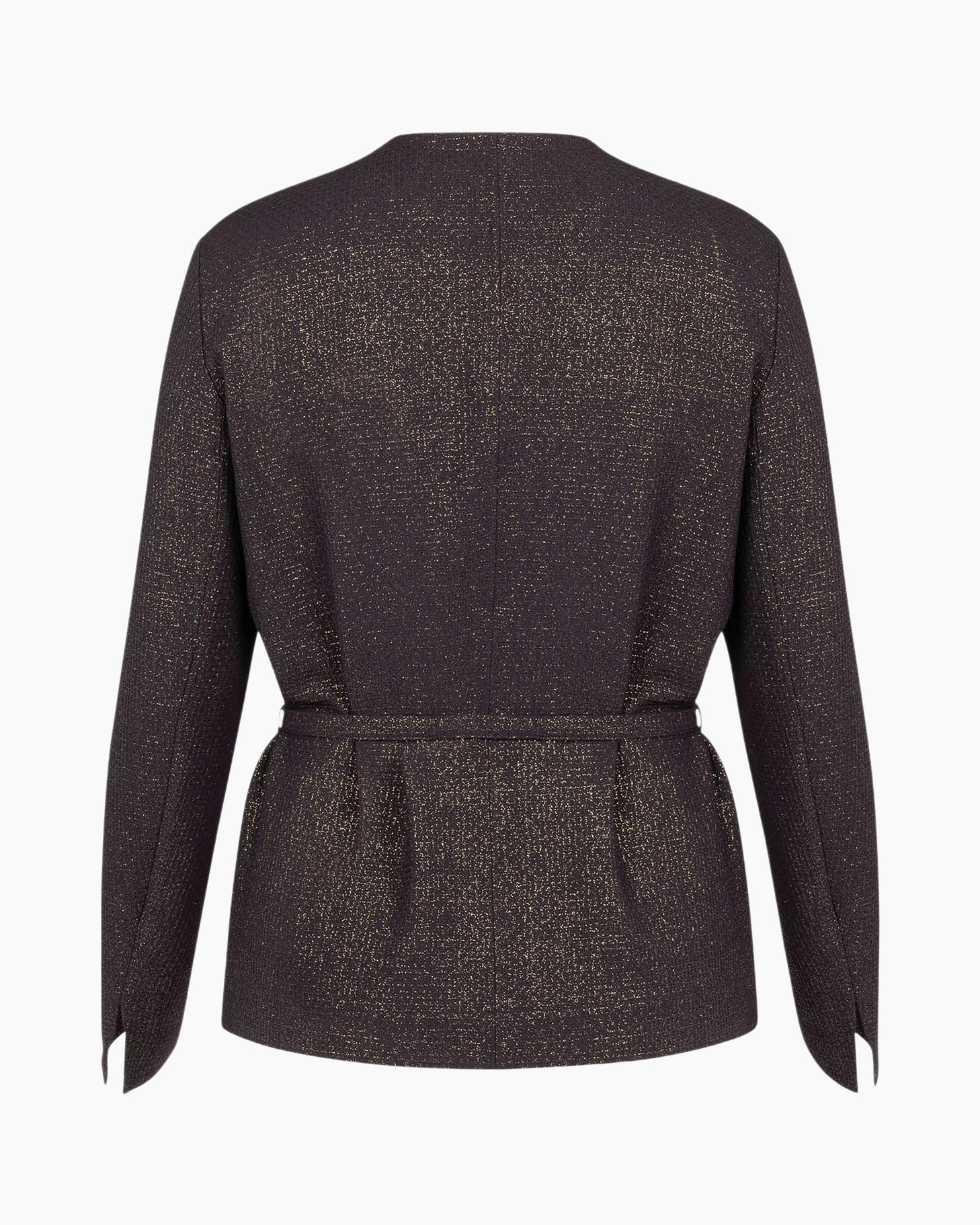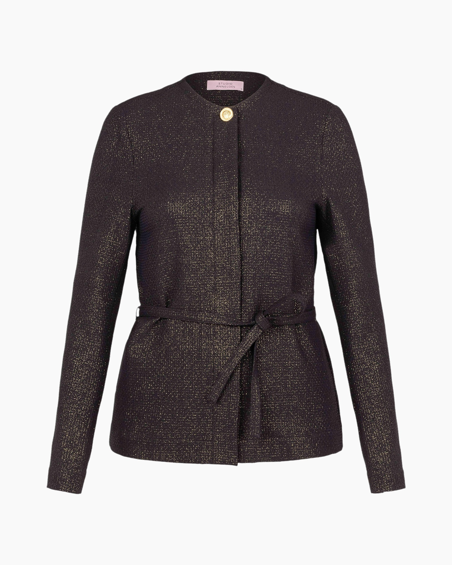 Hier zie je de Blazer Sanny Sparkle Waffle Blazer Licht Grijs van Studio Anneloes, een opvallend item voor jouw garderobe. De stof heeft een donkere basis, bijna zwart, verrijkt met goudkleurige spikkels die het licht mooi vangen. Dit geeft de blazer een unieke uitstraling. De blazer heeft een rechte pasvorm die je eenvoudig aanpast met de bijgeleverde strikceintuur rond de taille. Je kunt er ook voor kiezen om de ceintuur weg te laten, voor een losser silhouet. De kraagloze, ronde halslijn biedt een open en verzorgde look. Aan de voorkant sluit hij met een enkele, opvallende goudkleurige knoop bovenaan de hals, met een verborgen sluiting daaronder. Onderaan de lange mouwen zit een subtiele split, wat een doordacht detail is.