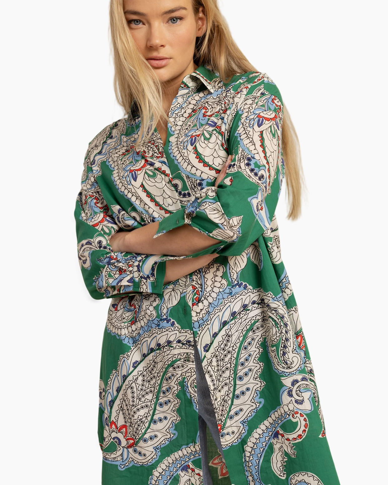Deze groene doorknoopblouse valt op door het kleurrijke paisley-patroon. De ruime lengte biedt comfort op warme zomerdagen. Je draagt deze top als verlengde blouse of tuniek. De katoenen stof ademt prettig en voelt zacht aan.