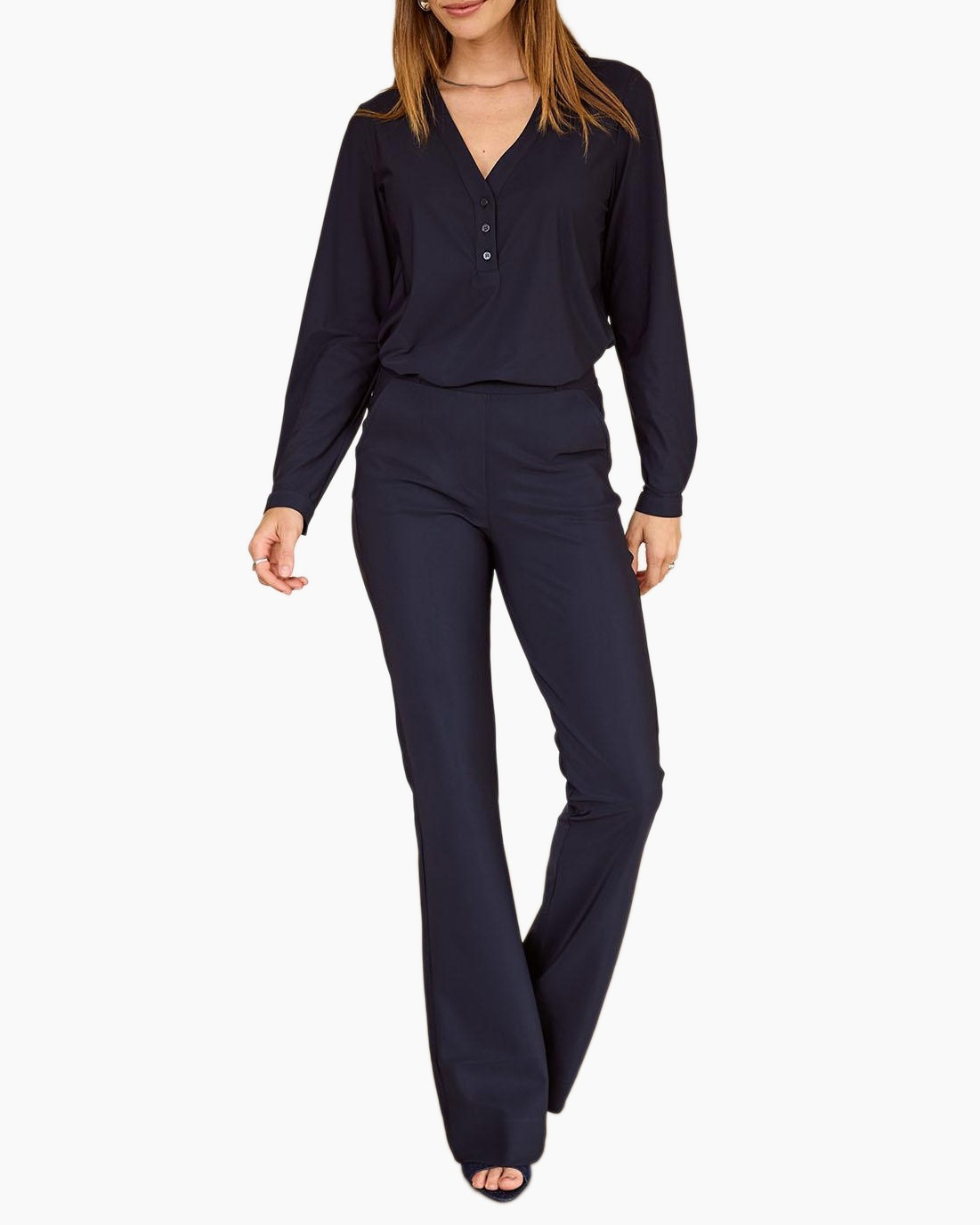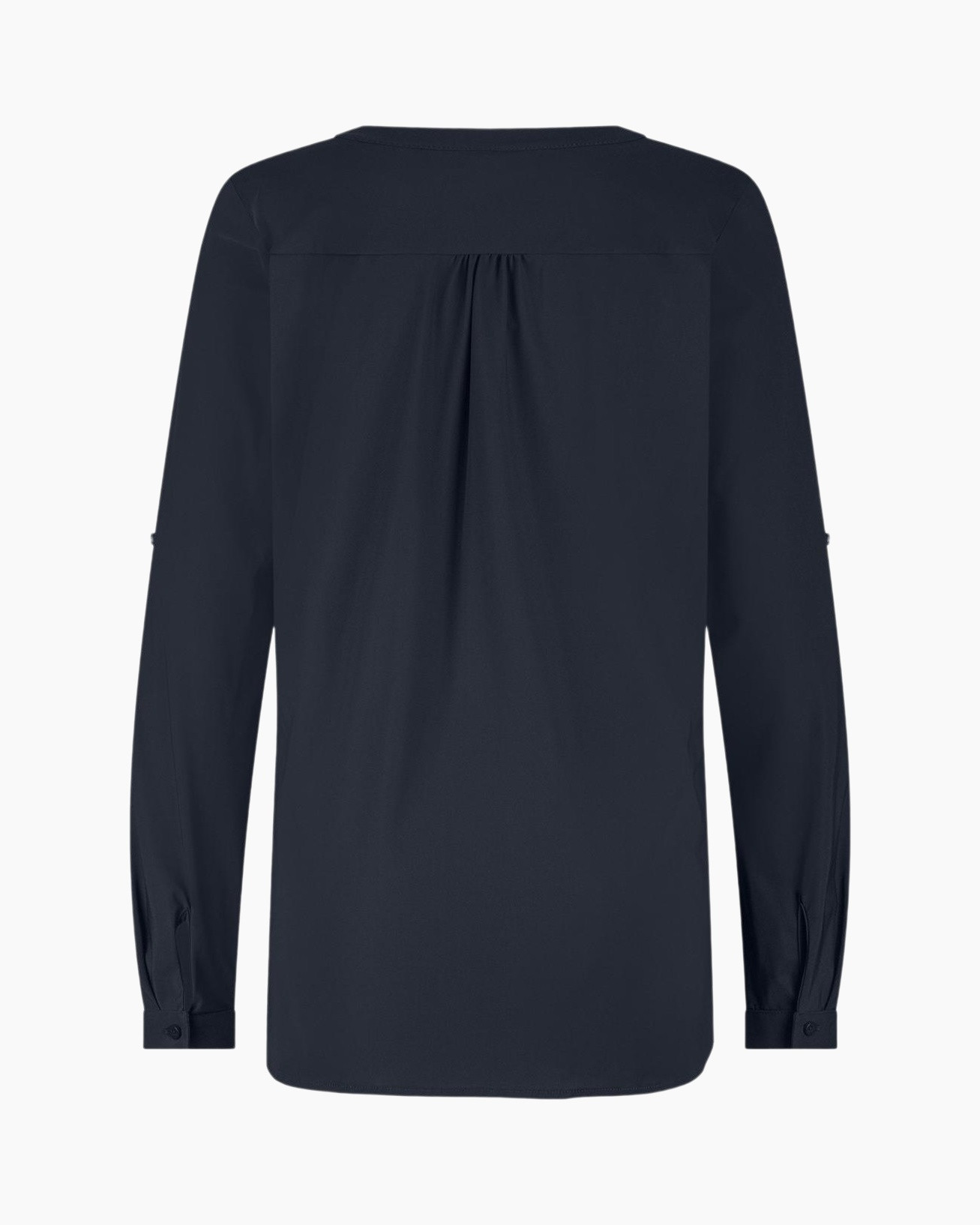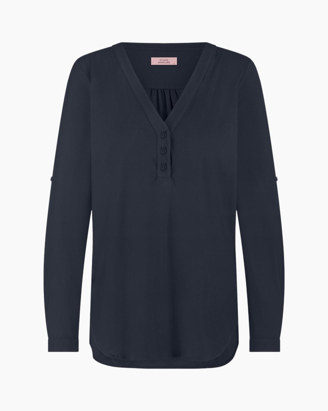 De blouse kenmerkt zich door een mooie V-hals, met subtiele plooien die de halslijn net dat beetje extra geven. Drie bijpassende knopen sieren de voorkant, wat zorgt voor een verzorgde afwerking. De lange mouwen kun je eenvoudig oprollen en vastzetten met de handige tab, ideaal om je outfit aan te passen. Je ziet een klein merkteken op de linkermouw, een detail dat kwaliteit aangeeft.