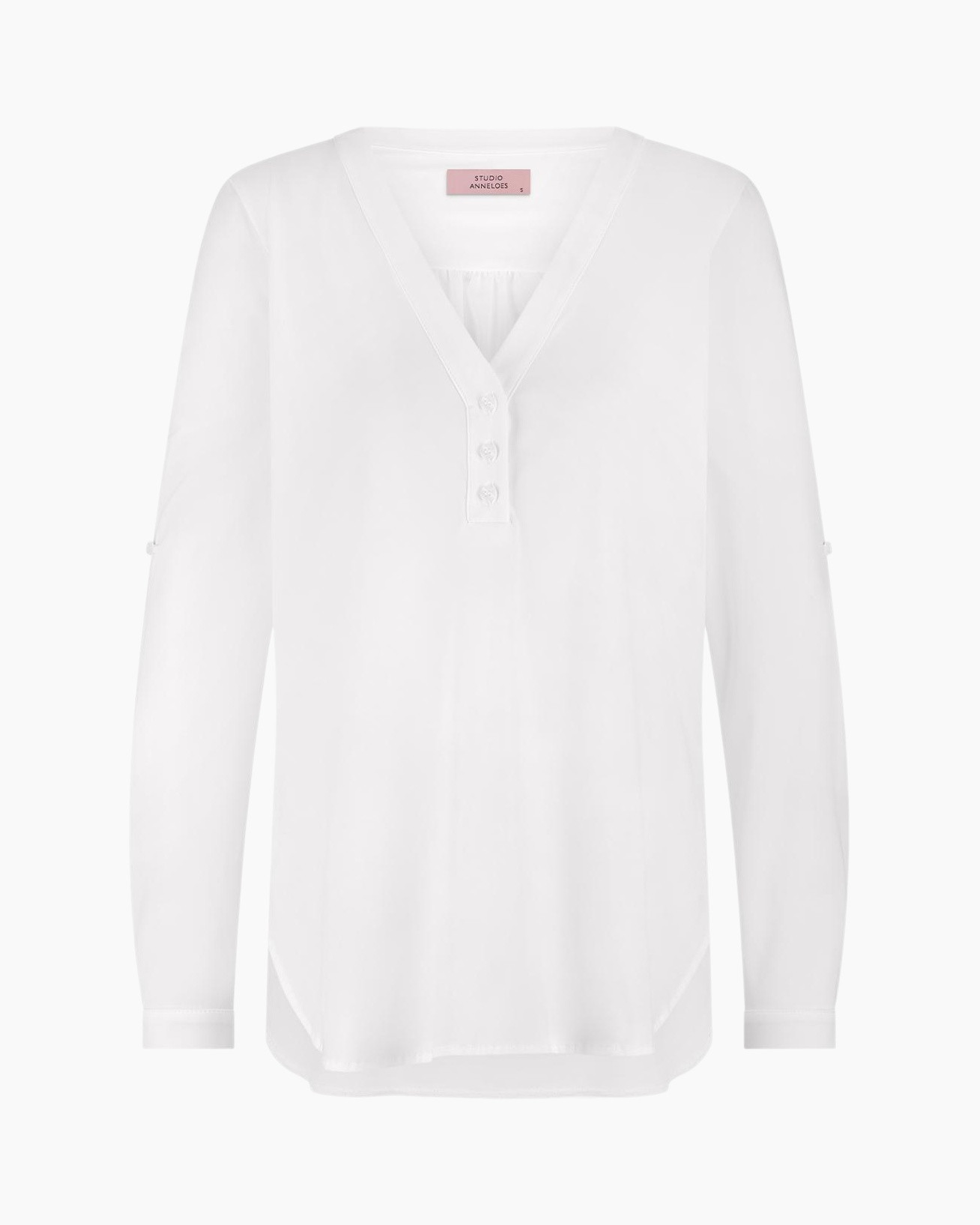 Je ziet hier Blouse Evi Wit van Studio Anneloes, een veelzijdig kledingstuk dat je veel combinatiemogelijkheden geeft. Deze blouse valt soepel om je lichaam en biedt je veel draagcomfort. De pasvorm is licht getailleerd, wat een prettig silhouet creëert. De helderwitte kleur past overal bij en fris je look op. Je ziet een V-hals die subtiel opent, met daaronder een korte knoopsluiting. Drie knopen geven een verzorgd detail. De lange mouwen kun je eenvoudig oprollen en vastzetten met de daarvoor bedoelde bandjes en knopen. Dit maakt de blouse geschikt voor verschillende weersomstandigheden. De onderkant heeft een afgeronde zoom, die je netjes over je broek kunt dragen of speels instopt.