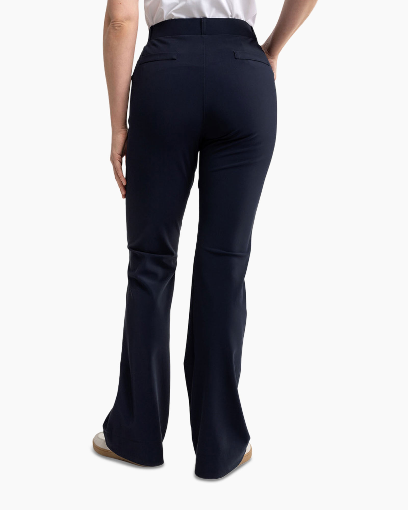 Deze zwarte broek straalt tijdloze elegantie uit en is geschikt voor diverse gelegenheden, van werk tot een avondje uit. De flared fit creëert een slank silhouet en verlengt je benen, terwijl de elastische tailleband extra comfort biedt gedurende de hele dag. De Bonded Travelstof, vervaardigd met gerecyclede garen, maakt deze broek niet alleen stijlvol en functioneel, maar ook een duurzame keuze voor je garderobe. De stof kreukt niet, droogt snel en is eenvoudig te onderhouden, waardoor hij perfect is voor een drukke levensstijl.