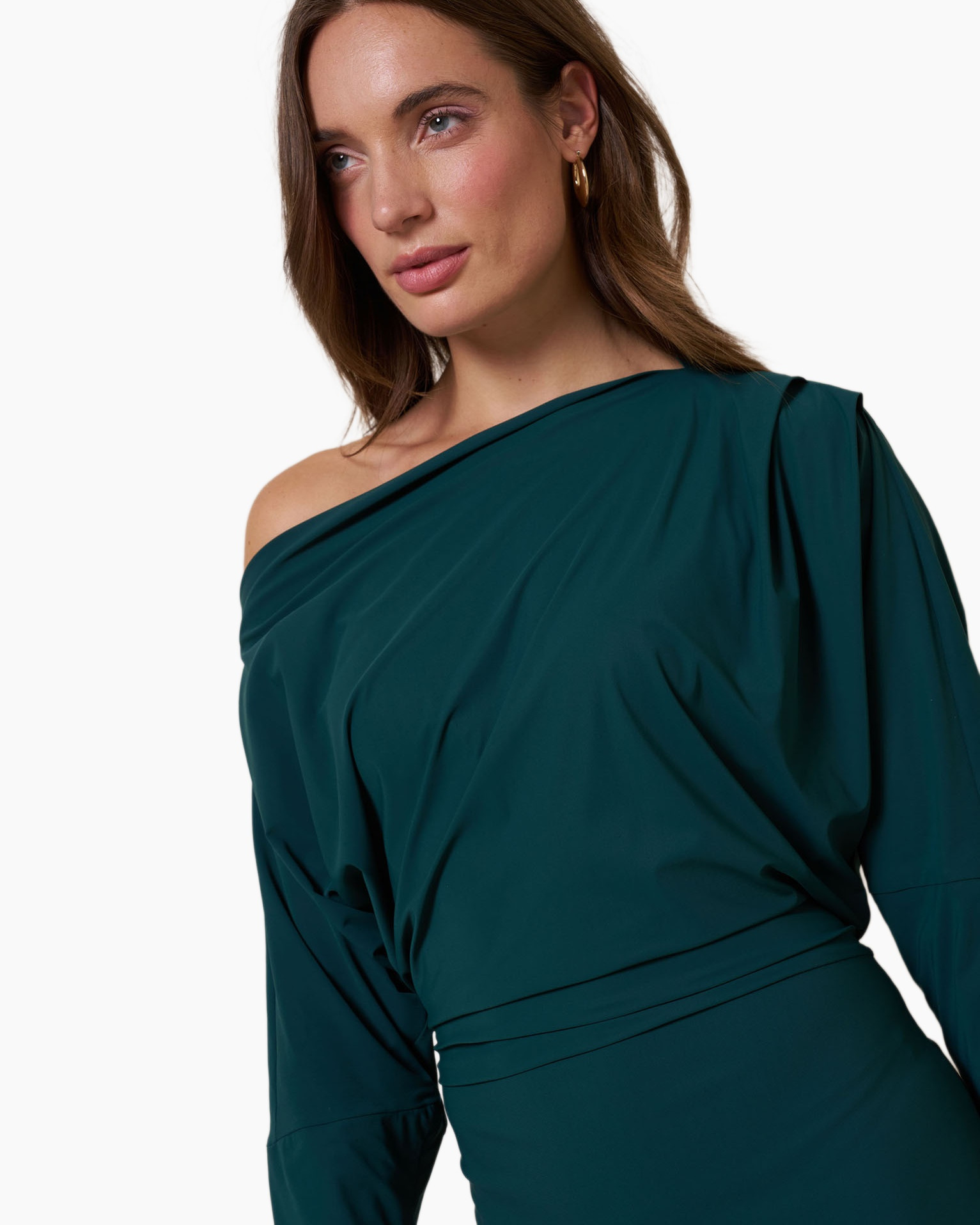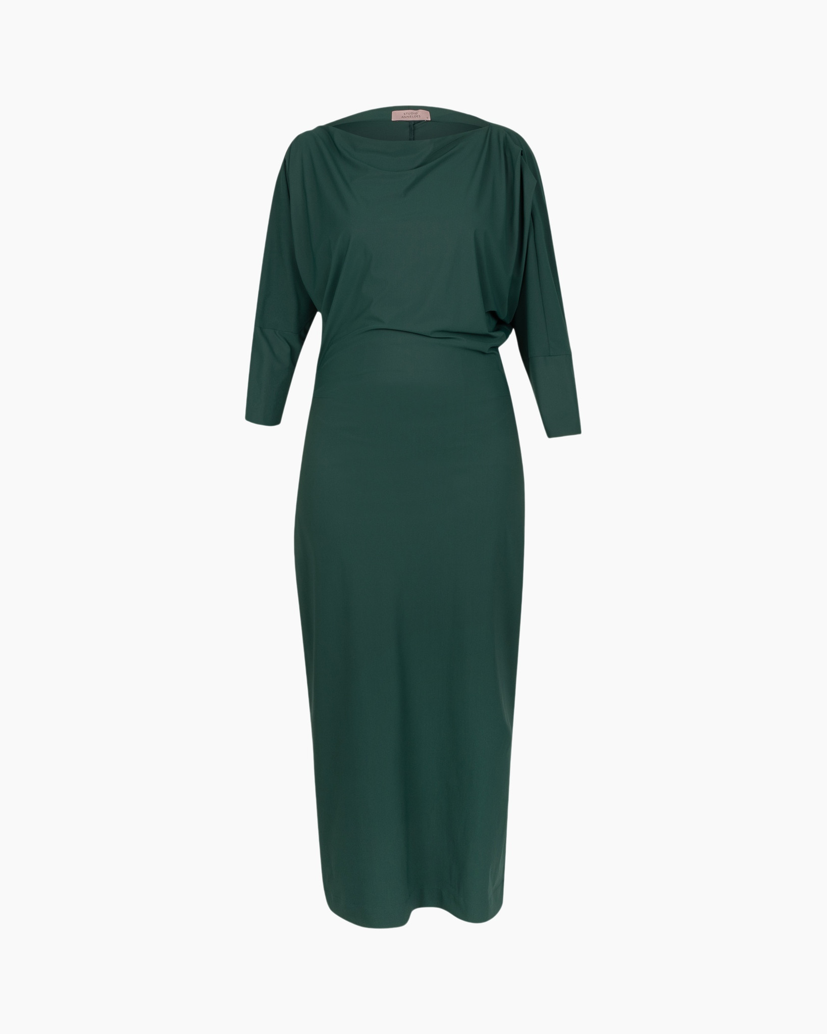 Jurk Ineke Ls Dress midden groen van Studio Anneloes is precies wat je zoekt als je een krachtig silhouet wilt creëren. Je ziet direct die diepe, volle groene kleur; een tint die rust uitstraalt. Deze jurk valt op door de slimme constructie. Het bovenstuk is ruim gesneden en heeft een zachte drapering rond de halslijn. Je kunt de brede halslijn zelfs over één schouder laten vallen. Dit geeft de jurk een bijzondere touch. De brede tailleband fixeert het geheel en accentueert je midden. De rok loopt recht naar beneden tot over de kuit. Let op de kleine split aan de zijkant. Dit detail maakt dat je soepel beweegt. De driekwart mouwen completeren dit item. Dit is een veelzijdig kledingstuk dat je keer op keer pakt.