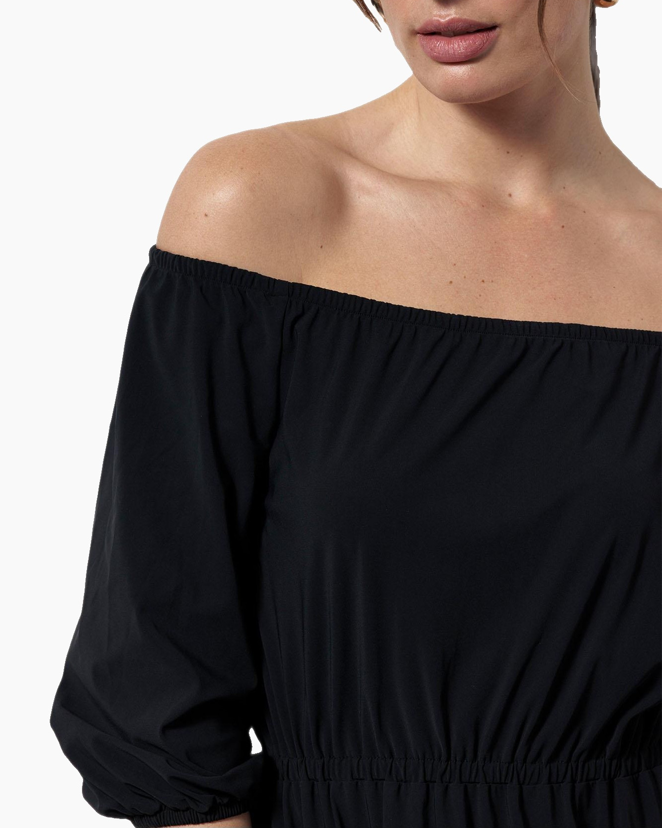 De Saturday dress in Black van Studio Anneloes is de perfecte combinatie van comfort en stijl. Deze zwarte jurk in Medium Travelstof heeft een vrouwelijke pasvorm en een off-shoulder design dat zorgt voor een speelse en elegante uitstraling. De elastische halslijn en taille geven de jurk een flatterend silhouet, terwijl de gesmokte driekwart mouwen een subtiele, bohemian touch toevoegen.