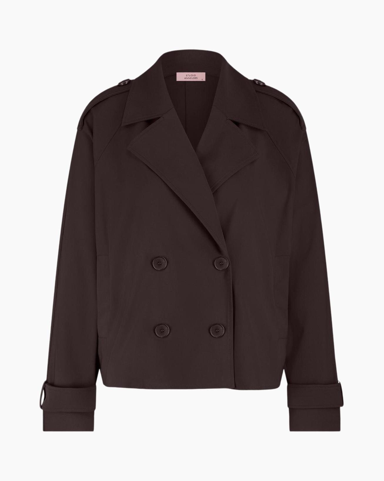 Laat je verrassen door de Mantel Cato Bonded Trenchcoat Donker Bruin van Studio Anneloes. Deze korte mantel geeft je outfit direct een stoere twist. Je ziet een ruimvallende pasvorm die je comfort biedt, terwijl de donkerbruine kleur makkelijk combineert. De jas heeft een klassieke dubbele knoopsluiting aan de voorzijde, met matchende donkere knopen. Ook vallen de brede reverskraag en de schouderflappen op. Aan de zijkant zijn er praktische steekzakken. De mouwen zijn afgewerkt met een verstelbaar bandje en een knoop, wat een speels effect geeft als je ze omslaat. De lengte van de jas is cropped, en valt tot de heupen, voor een actieve uitstraling.