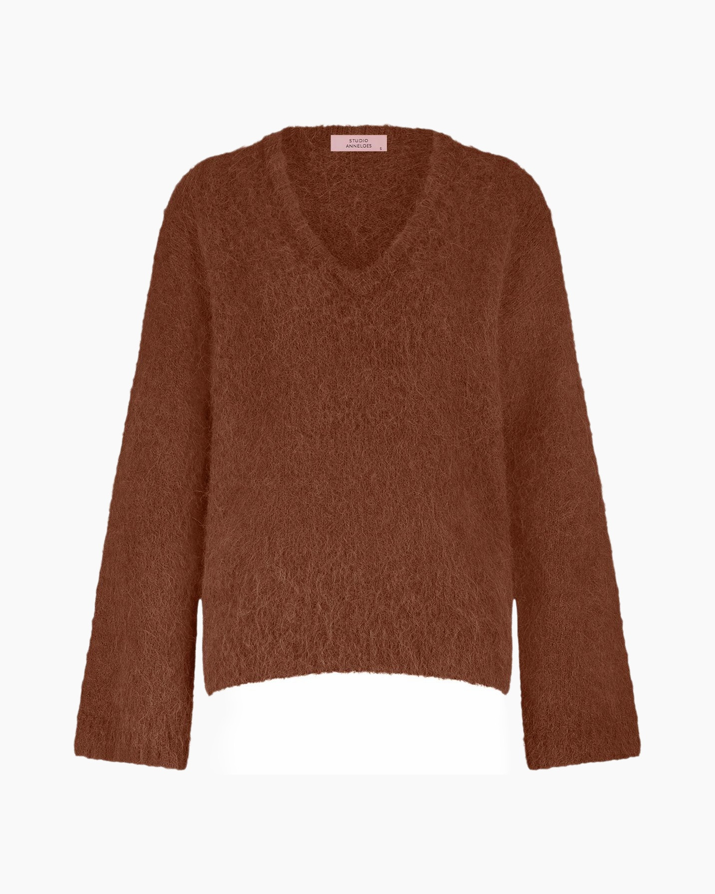 Bekijk de Pullover Liana Vneck Pullover Zand van Studio Anneloes, een kledingstuk dat je met gemak draagt en veelzijdig combineert. Deze pullover valt ruim en heeft een heerlijke zachte uitstraling, duidelijk zichtbaar door de pluizige textuur van de stof. De lange mouwen en relaxte pasvorm zorgen voor veel draagcomfort. Je ziet een diepe V-hals die een open karakter geeft aan het kledingstuk. De warme bruintint, vergelijkbaar met terracotta, voegt direct sfeer toe aan jouw dagelijkse outfit. De focus ligt hierbij volledig op het rijke materiaal en de fijne pasvorm, wat het een ideaal basisstuk voor je kledingkast maakt.
