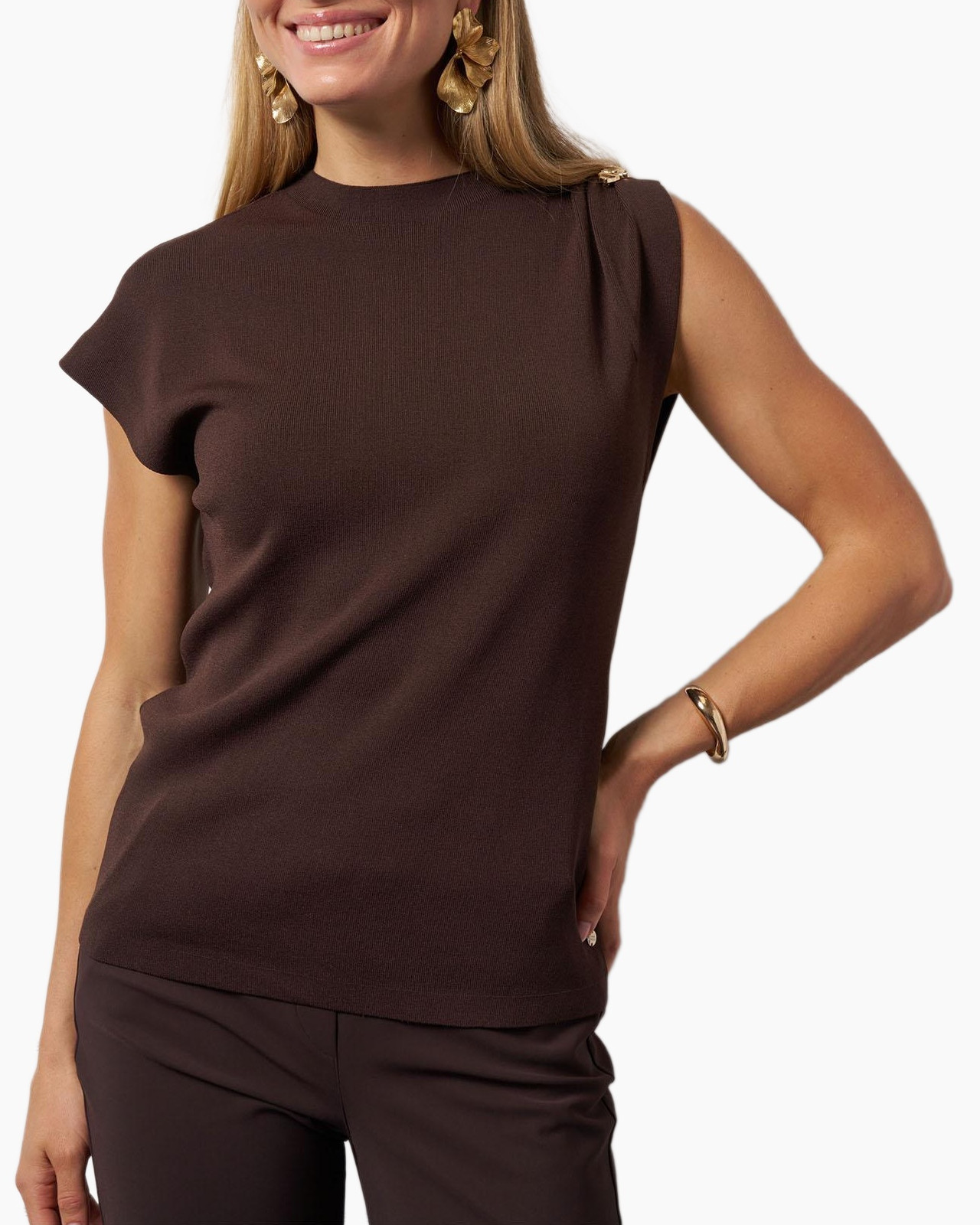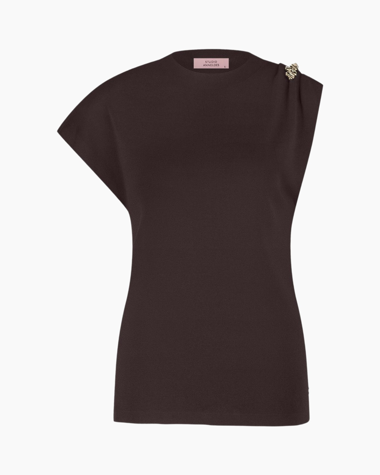 Vandaag laten we je de Top Fanny Button Top Donker Bruin van Studio Anneloes zien, een aanwinst die je graag draagt. Dit kledingstuk valt mooi langs je lichaam en zorgt voor een verzorgde uitstraling. De diepe, donkerbruine kleur staat prachtig en vormt een veelzijdige basis voor je outfit. De top heeft een opstaande kraag die de halslijn netjes omkadert. Korte mouwen zorgen voor een fijne pasvorm. Op één van de schouders vind je goudkleurige knopen met een interessante textuur. Deze details geven het item een extra dimensie. De stof heeft een subtiel ribpatroon dat bijdraagt aan de rijke uitstraling van de top.