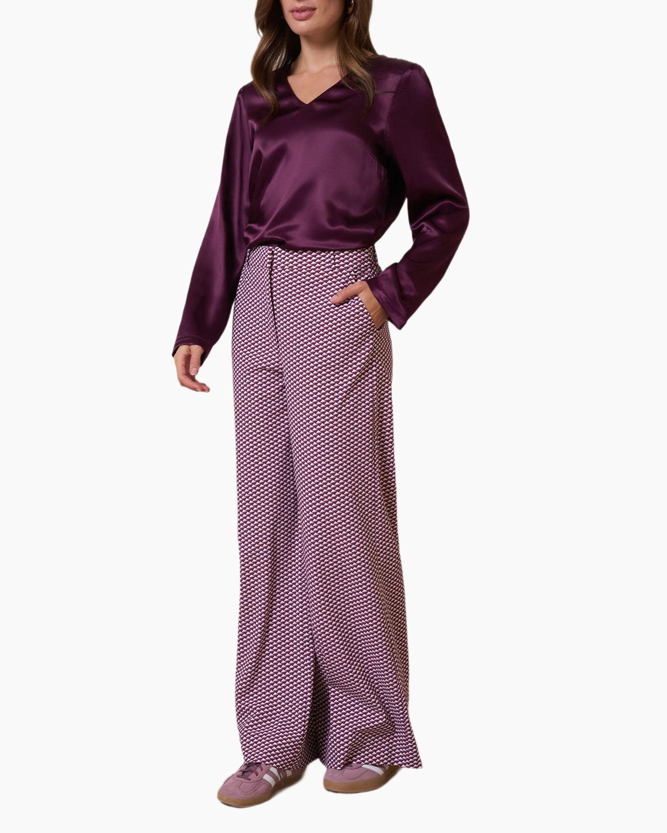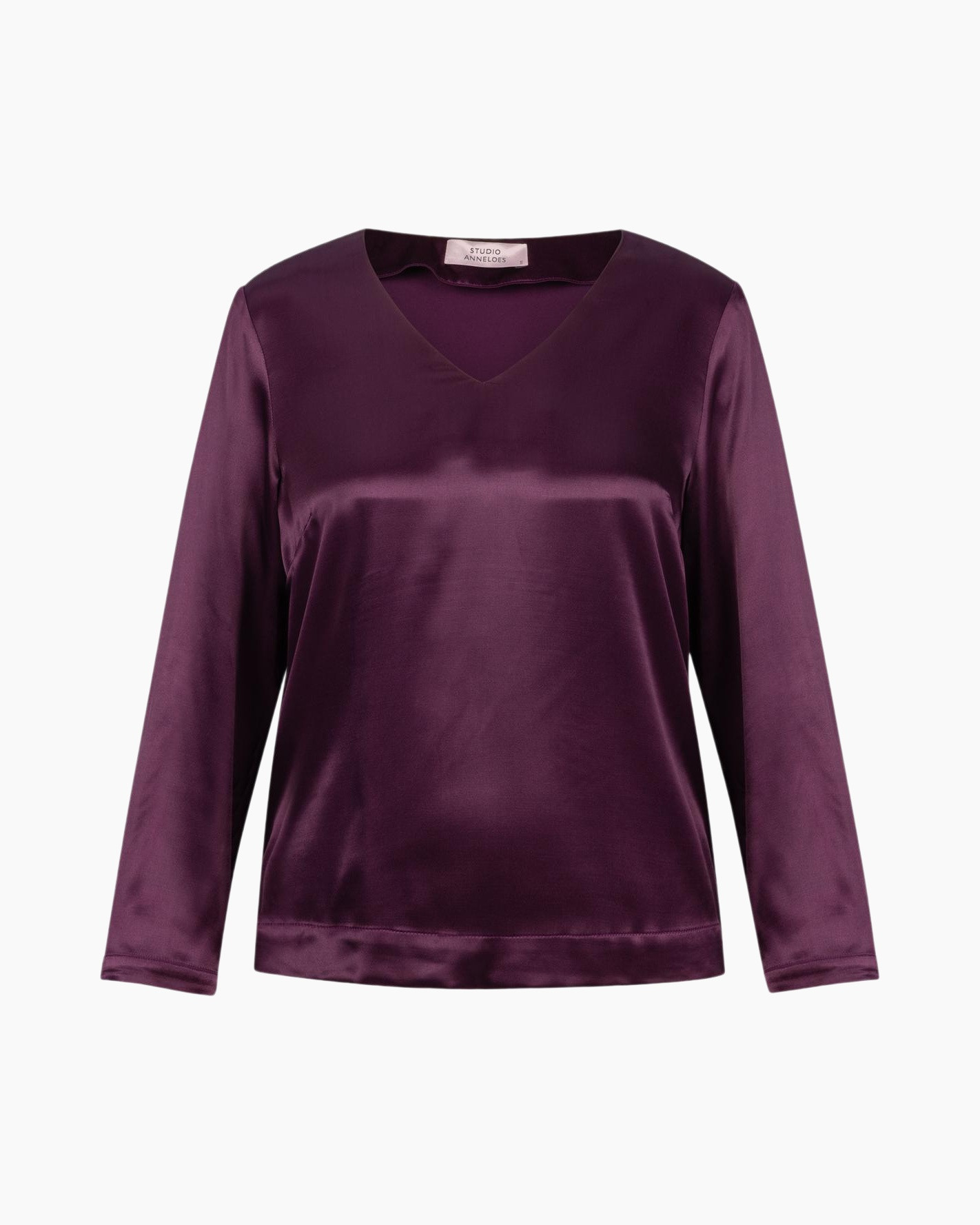 De Top Madison Satin Top Paars van Studio Anneloes voegt direct een rijke uitstraling toe aan je garderobe. Je ziet een comfortabele pasvorm die soepel valt, wat zorgt voor een fijne bewegingsvrijheid. Deze top heeft een V-hals, die je de mogelijkheid geeft om er bijvoorbeeld een subtiele ketting bij te dragen. De paarse kleur heeft een diepe, verzadigde toon die je makkelijk combineert. Aan de mouwen zit een knoopsluiting bij de manchetten, waarbij een kleine split een geraffineerd accent geeft. De stof heeft een lichte glans, wat de top een zachte look geeft. Er zijn geen opzichtige knopen aan de voorzijde of zakken aanwezig, wat bijdraagt aan de strakke lijn van het kledingstuk. De zoom is recht en geeft je de optie om de top in of over je broek te dragen.