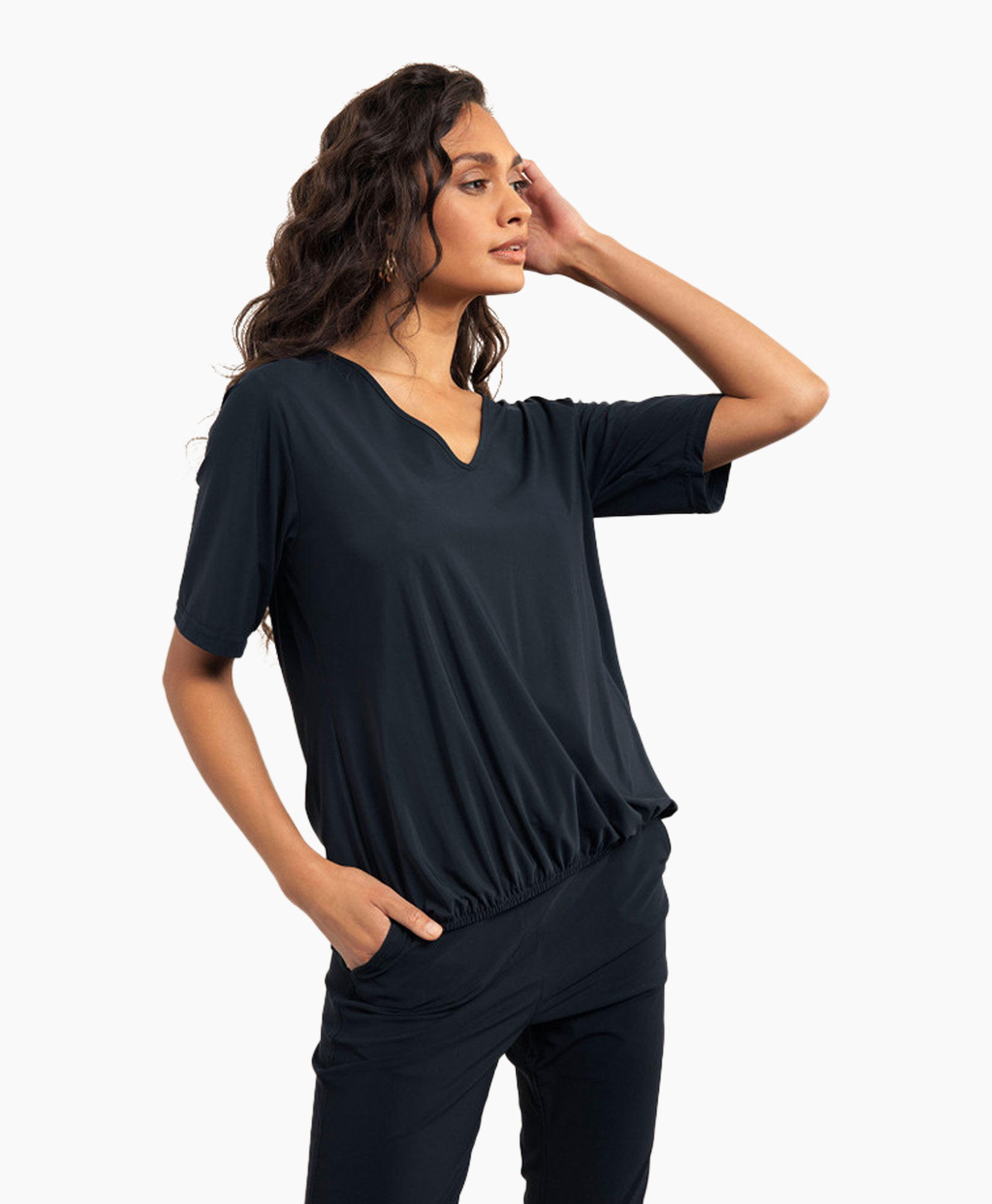 Het Vicky shirt van Studio Anneloes is een basic die perfect valt en daarom in elke zomergarderobe thuishoort. Het donkerblauwe shirt heeft een loose fit. Door de elastische boord aan de voorkant, ontstaat een bloezend effect. De Vicky heeft een V-hals en korte mouwen. De mouwen zijn iets langer dan standaard korte mouwen (28cm).