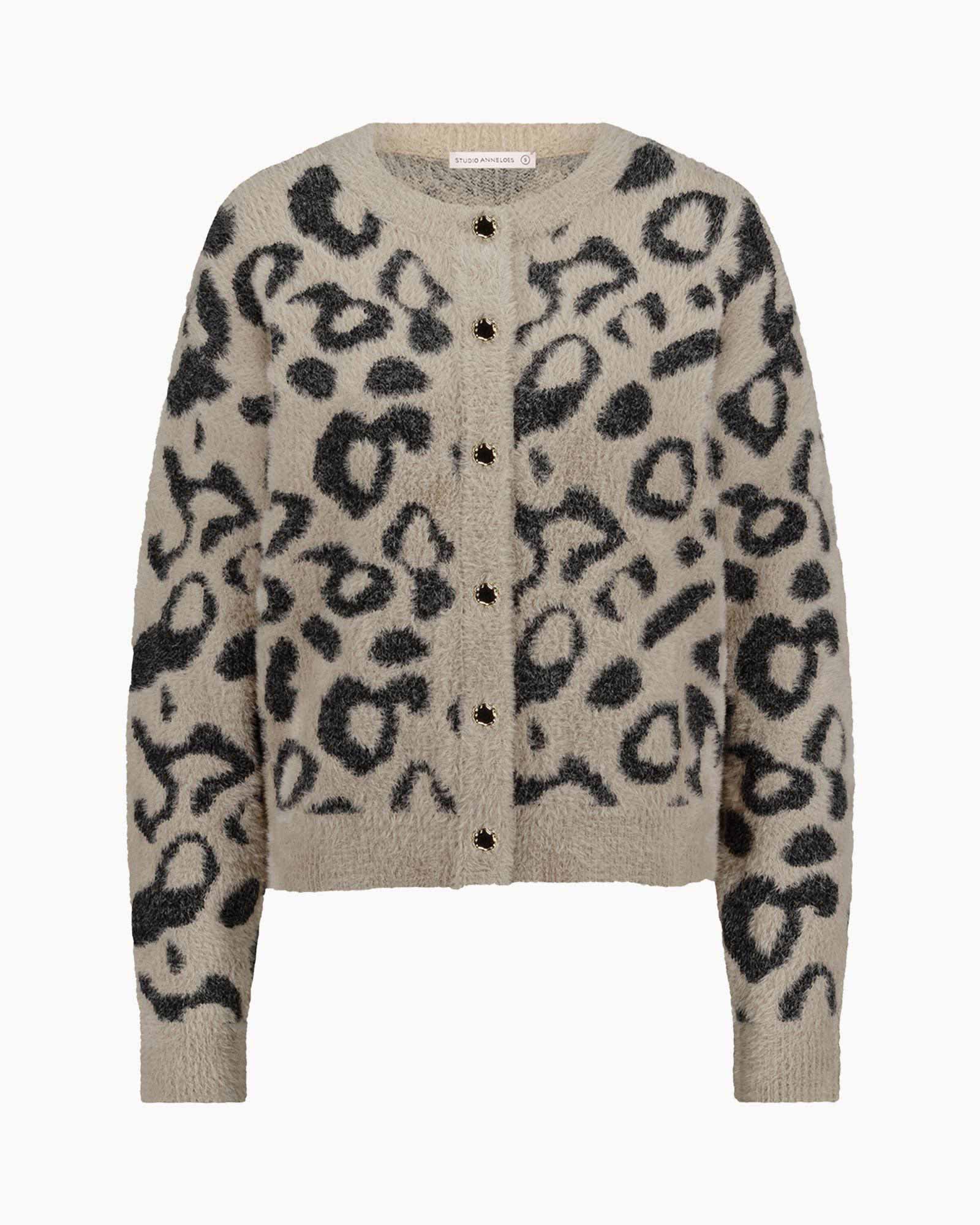 De Bibi leopard mink cardigan van Studio Anneloes is een opvallend item dat je outfit een speelse touch geeft. Dit vest, met een stijlvolle animal print uitgevoerd in de kleuren Latte en Black, combineert comfort met een trendy uitstraling. De wide fit en de extra zachte stof maken het een heerlijk item om te dragen. De gouden knopen en de ronde hals voegen een vleugje verfijning toe aan het ontwerp.