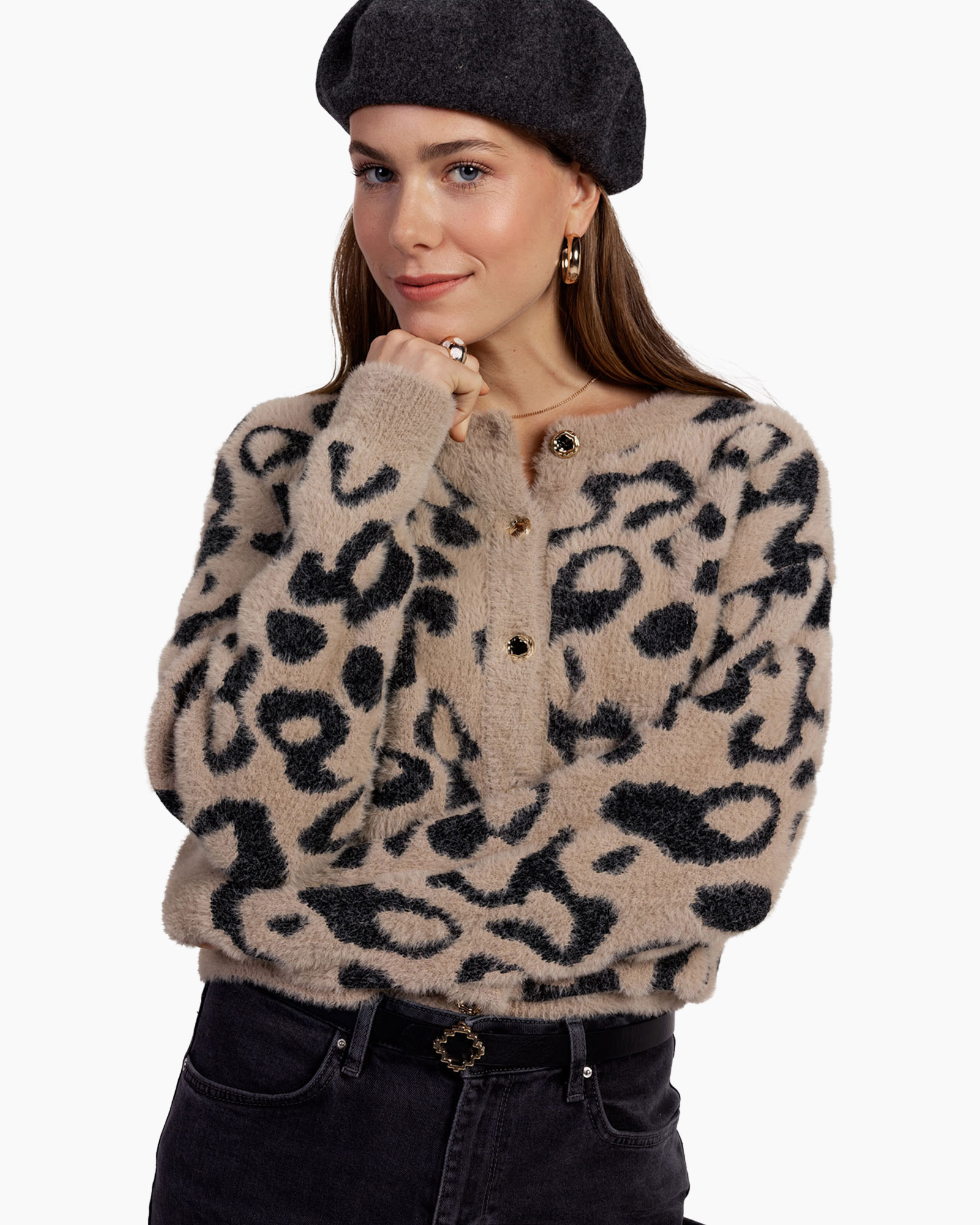 Dit vest is ideaal voor de koudere dagen, dankzij het zachte materiaal en de comfortabele pasvorm. Voeg minimalistische accessoires toe om de gouden knopen te benadrukken en creëer een stijlvolle, eigentijdse outfit met de Bibi leopard mink cardigan.
