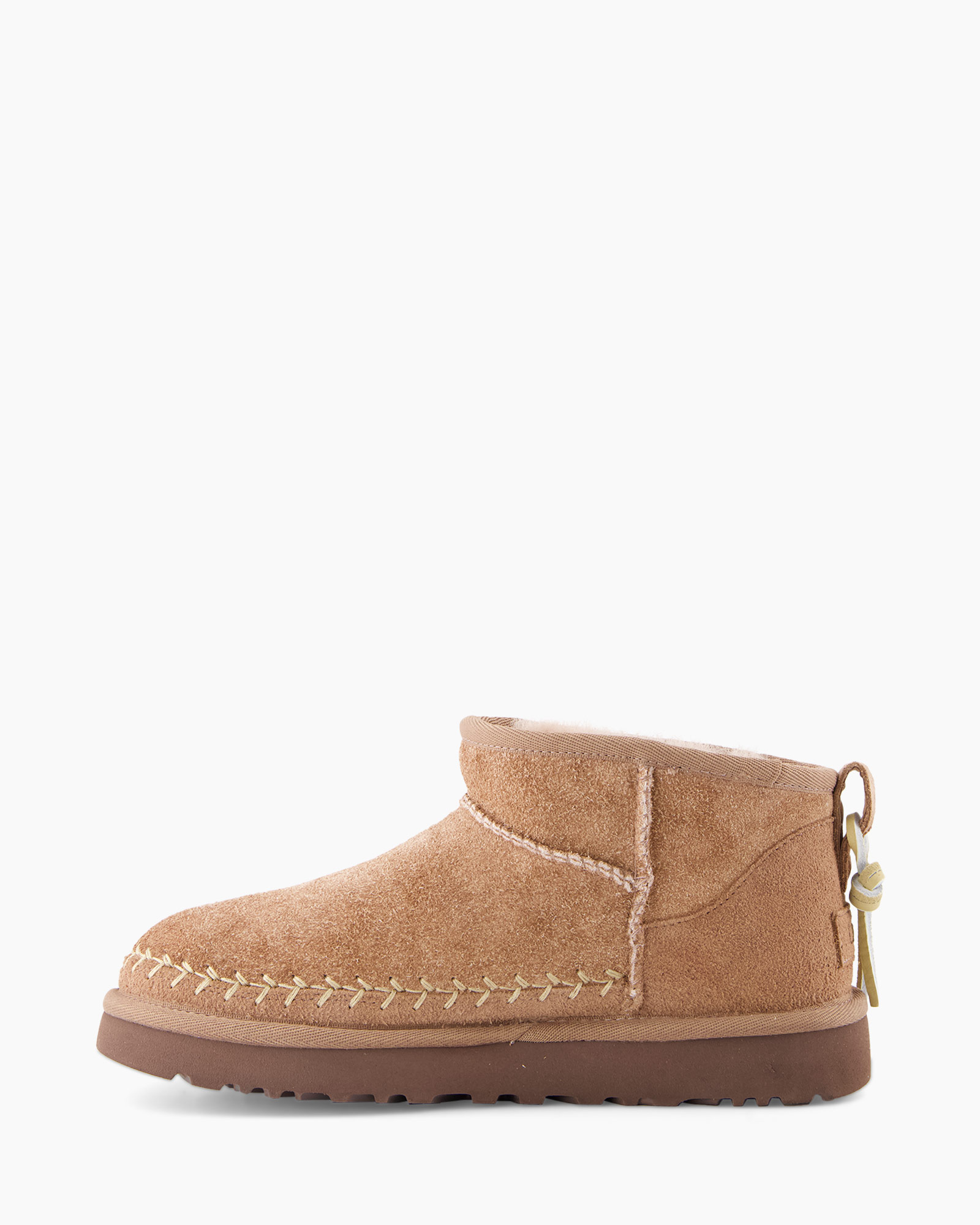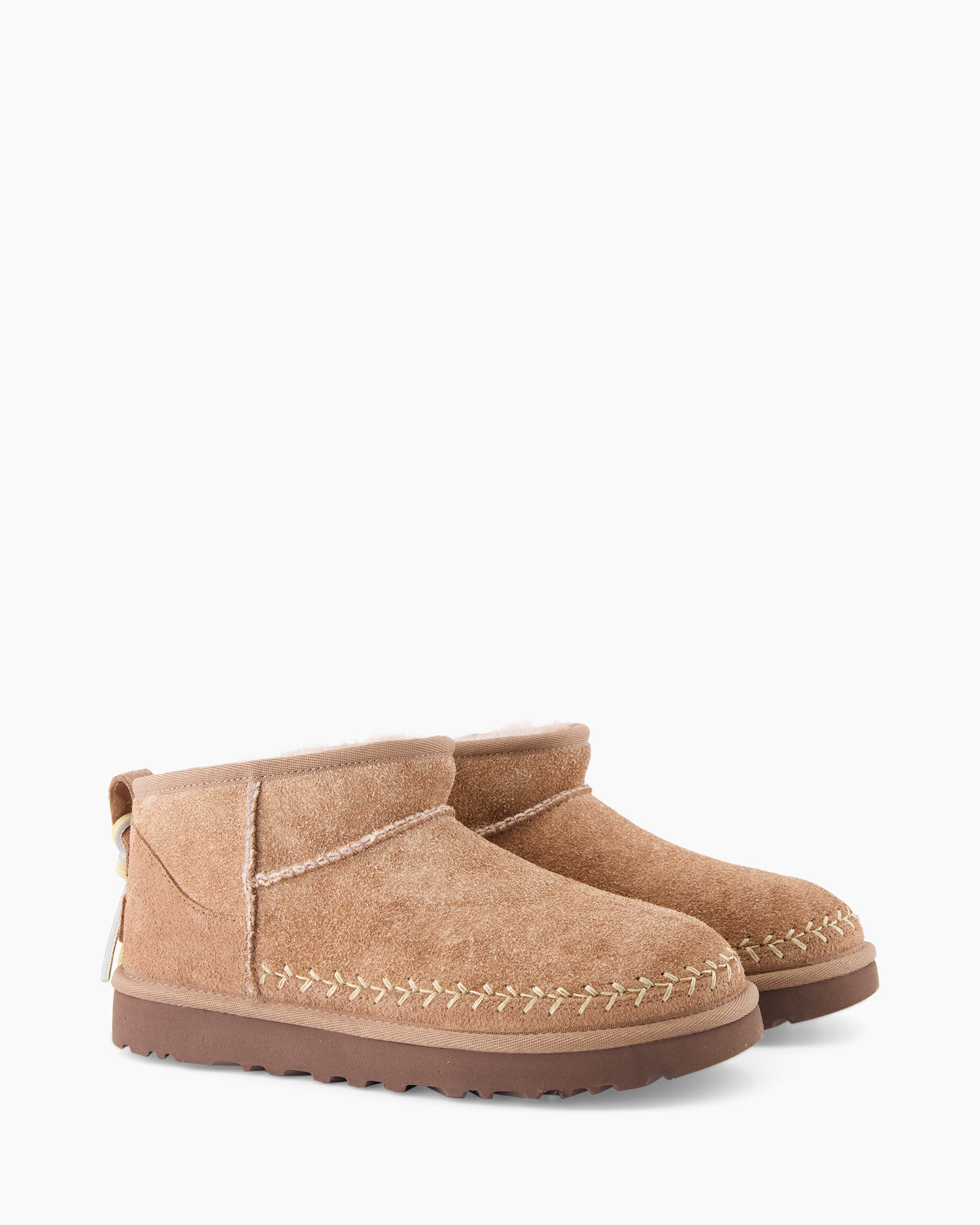 De Enkellaars Classic Ultra Mini Biarritz Bruin van Ugg combineert comfort met een stijlvolle uitstraling. Dit enkellaarsje, gemaakt van hoogwaardig suède, biedt je een comfortabele pasvorm ideaal voor dagelijks gebruik. De rijke bruine kleur geeft de schoen een warme uitstraling.