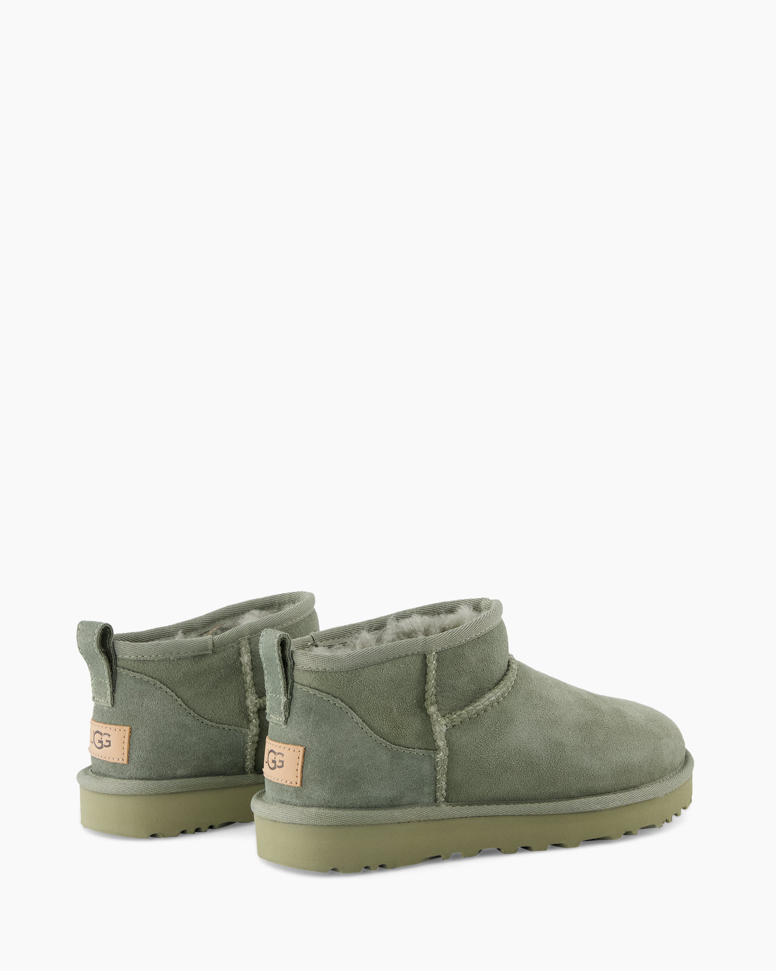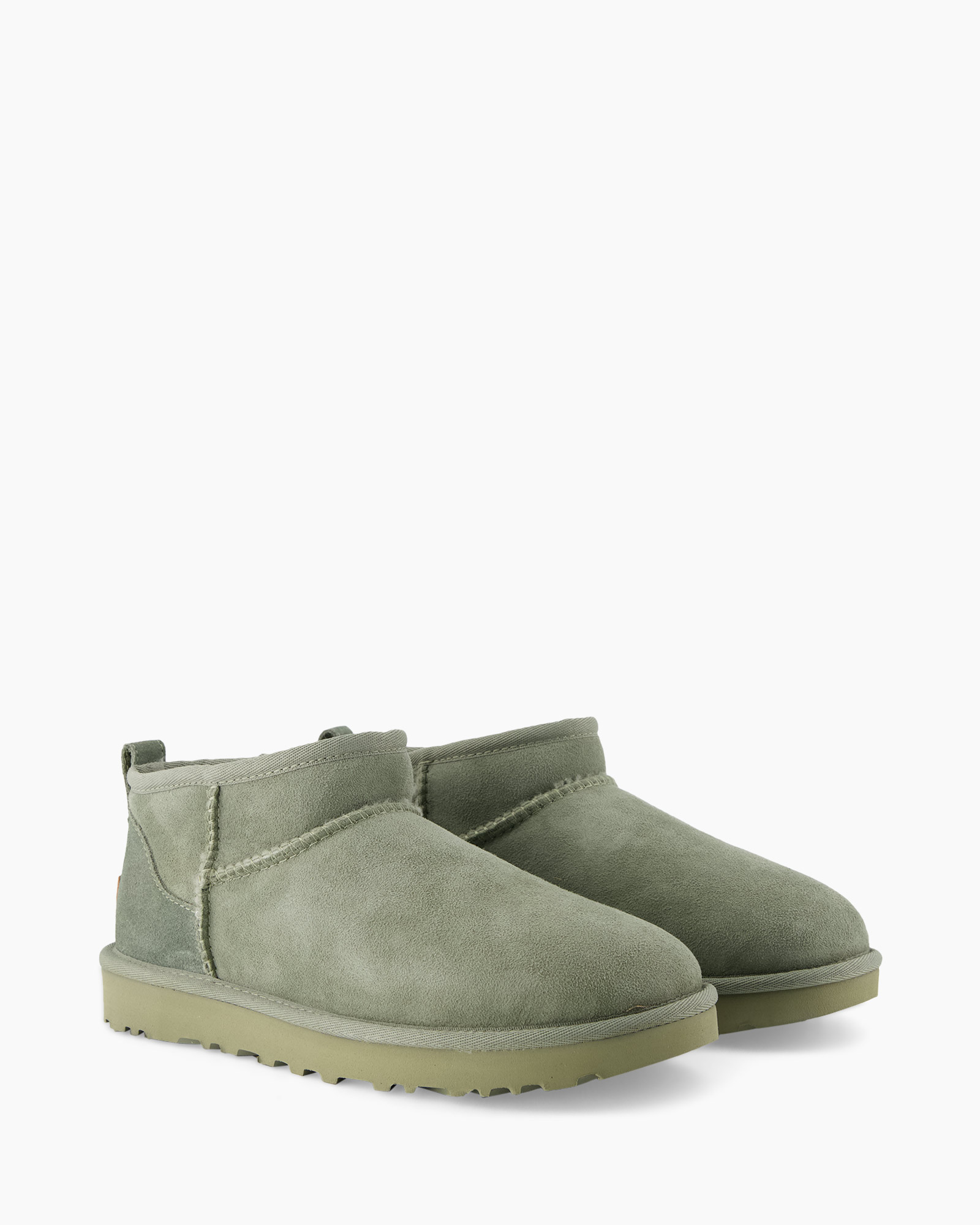 Enkellaars Classic Ultra Mini Khaki van Ugg zit zacht aan je voeten. Deze enkellaars heeft een lage schacht en een groene kleur. Het suède materiaal en de stevige zool maken de schoen geschikt voor elke dag. Je trekt ze makkelijk aan omdat dit model geen veters heeft.
