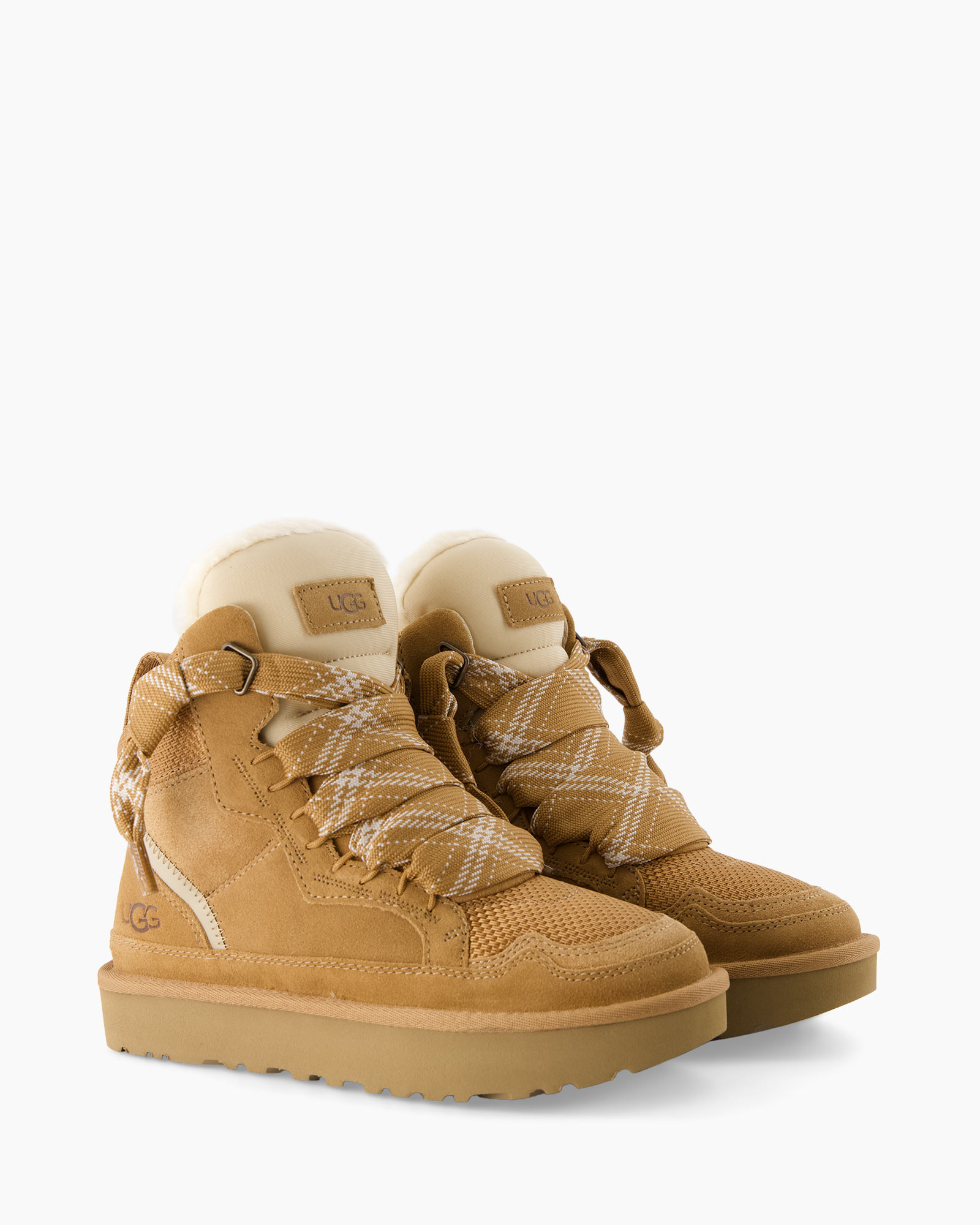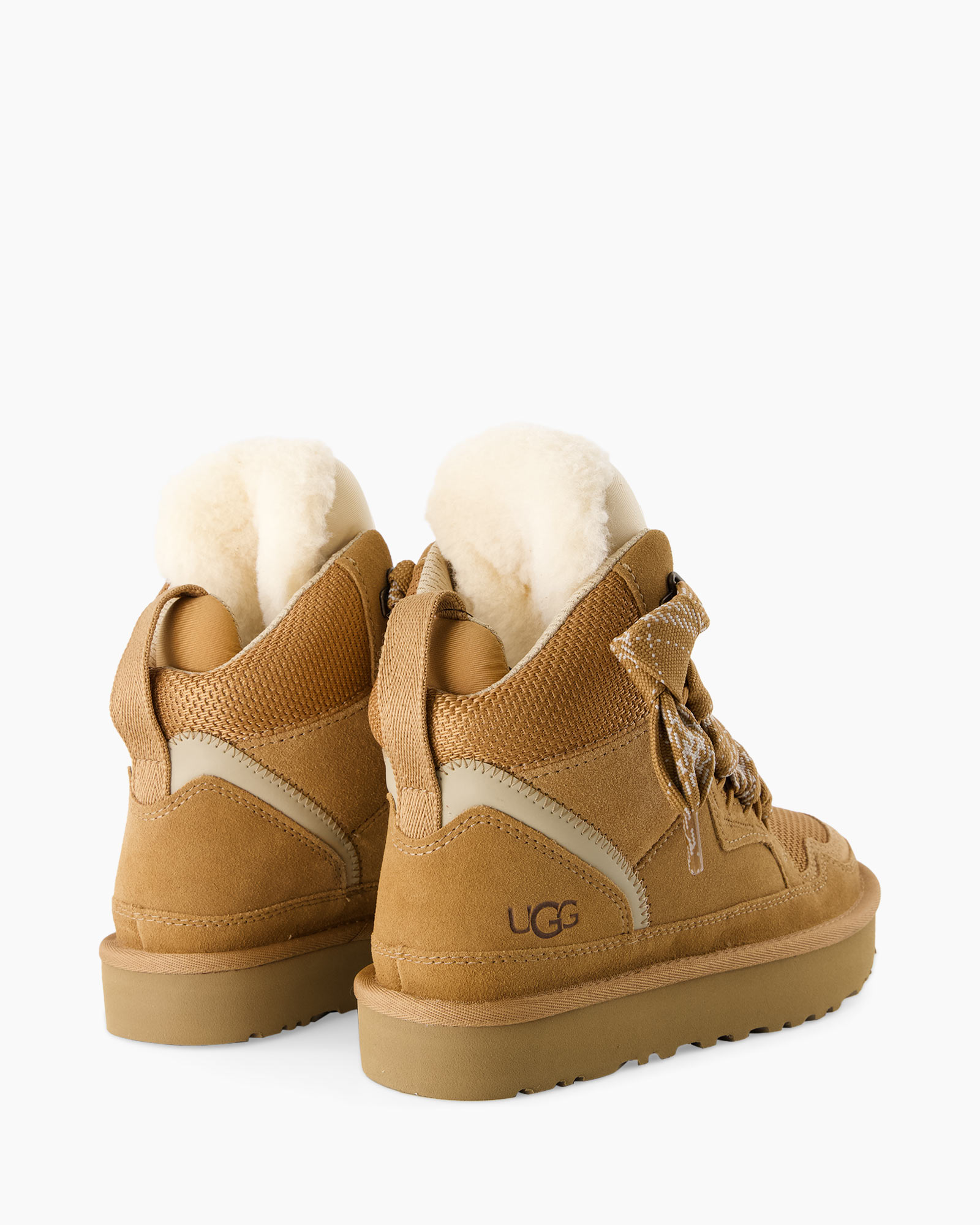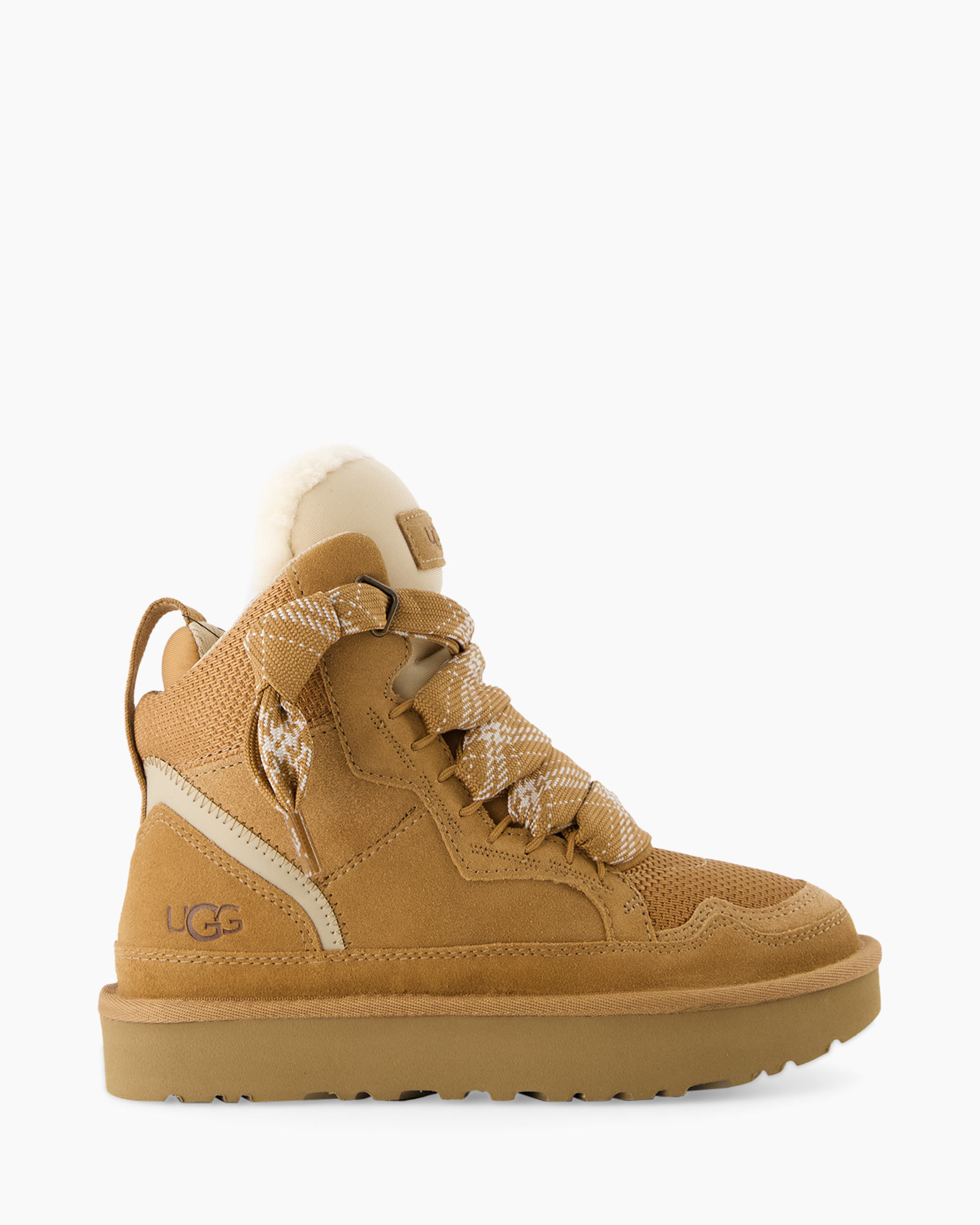 De laarzen zijn gemaakt van hoogwaardig suède dat zich fijn naar de voet vormt. De brede veters met subtiele patronen voegen een uniek detail toe en het herkenbare Ugg-logo is stijlvol verwerkt aan de zijkant van de laars.