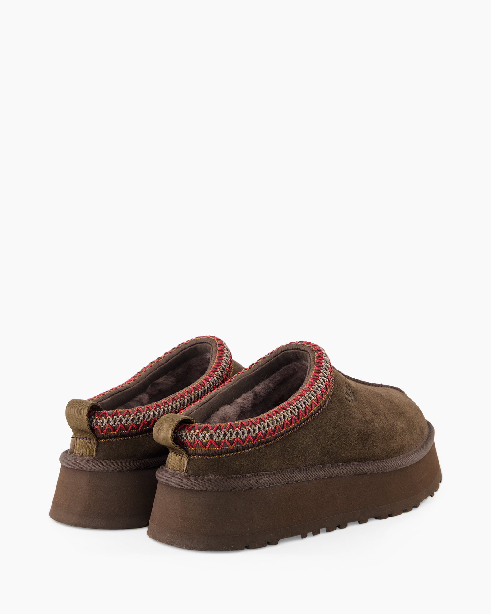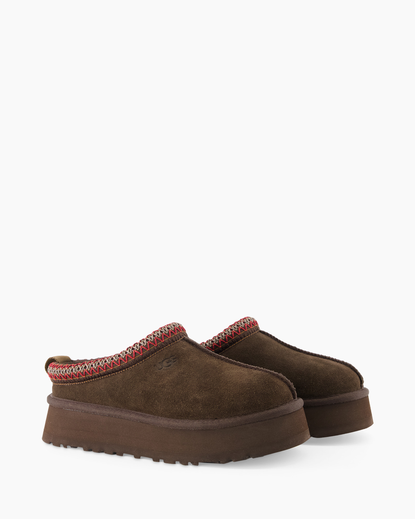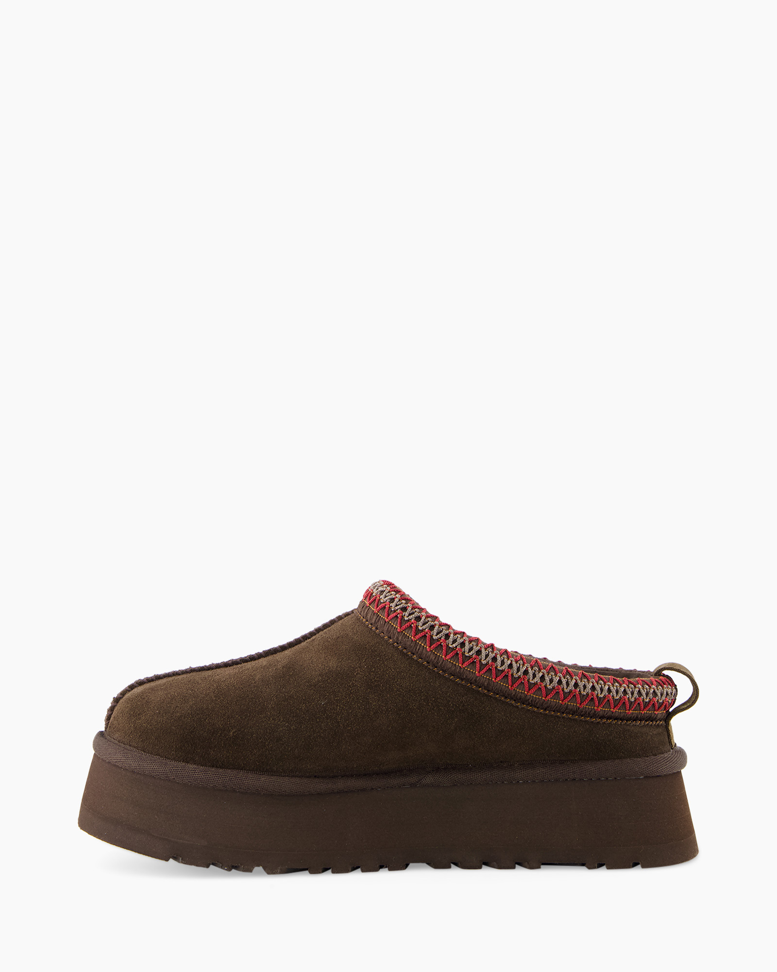 Het suède materiaal zorgt voor een luxe gevoel en uitstekend draagcomfort. De schoen heeft een subtiel Ugg-logo en opvallend stiksel in rood en beige aan de bovenrand, wat een unieke touch geeft. De stevige zool biedt grip en stabiliteit.