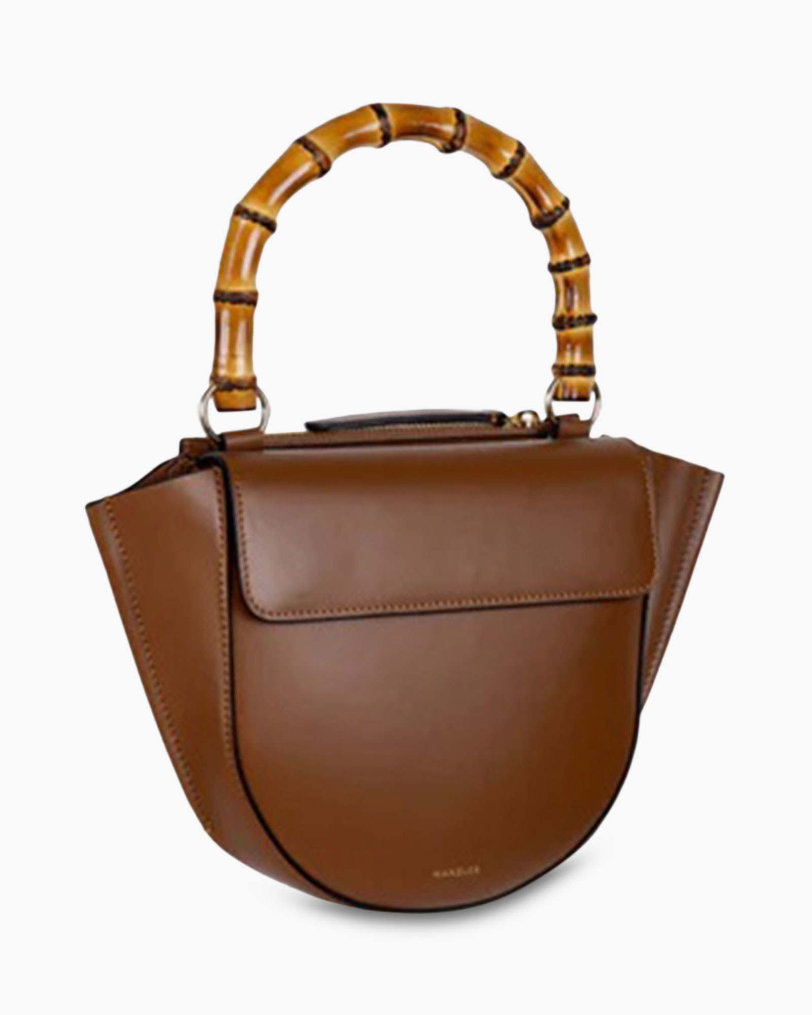 Crossbody Tas Hortensia Mini Bamboo Bruin van Wandler geeft je een warme uitstraling door het gladde leer in een bruine kleur. Dit model valt op door de halfronde vorm met zijkanten die naar buiten staan. Je bergt je spullen veilig op achter de rits aan de bovenkant. Met de verstelbare riem of het handvat van bamboe draag je de tas op de manier die bij je past.