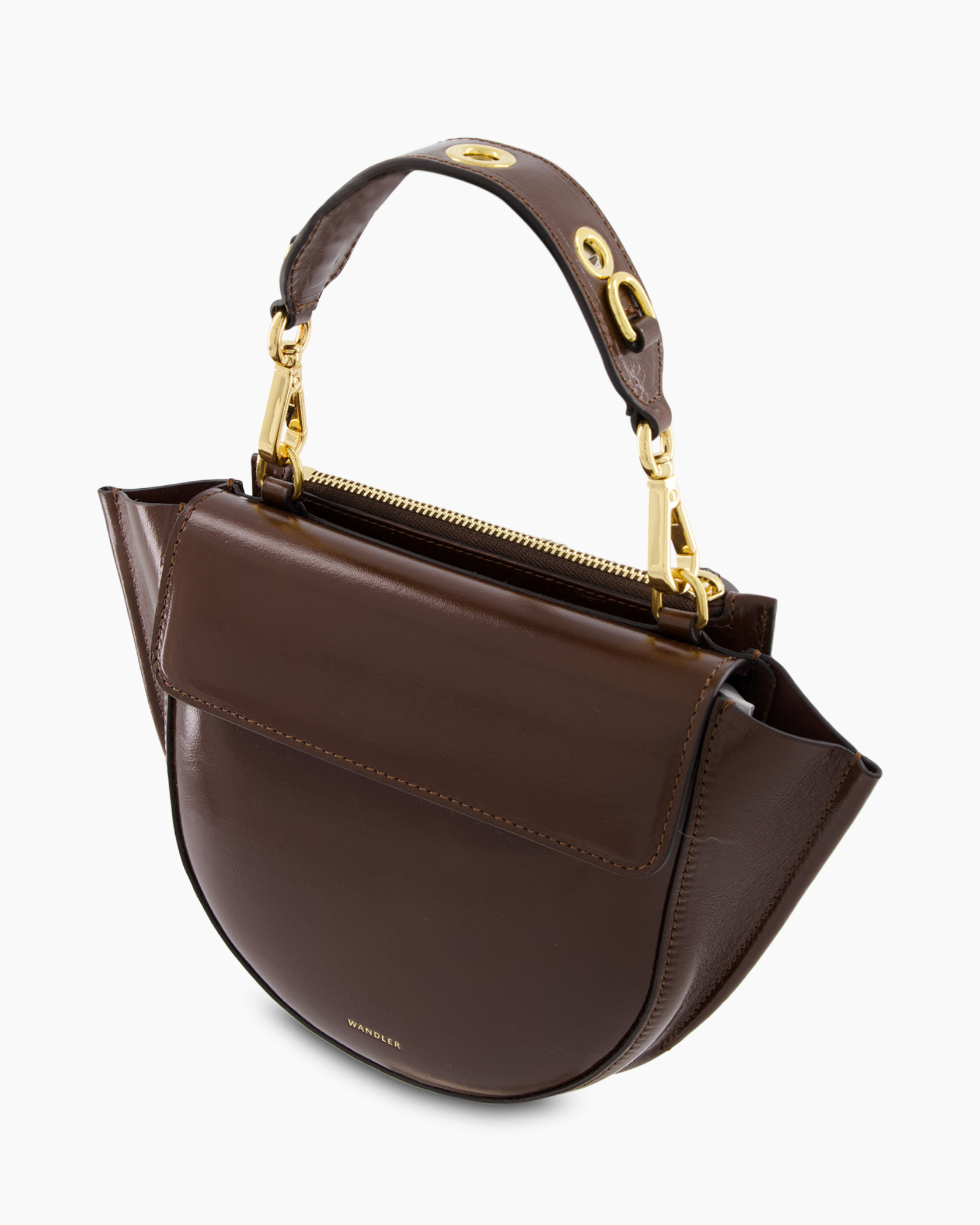 Crossbody Tas Hortensia Mini Eyelets Donker Bruin van Wandler is een handtas die je outfit direct een krachtige uitstraling geeft. Je draagt dit model van glanzend donkerbruin leer aan de stevige handgreep. Het ontwerp valt op door de halfronde onderkant en de zijkanten die breed uitlopen. Gouden details en een rits maken dit item compleet voor elke gelegenheid.