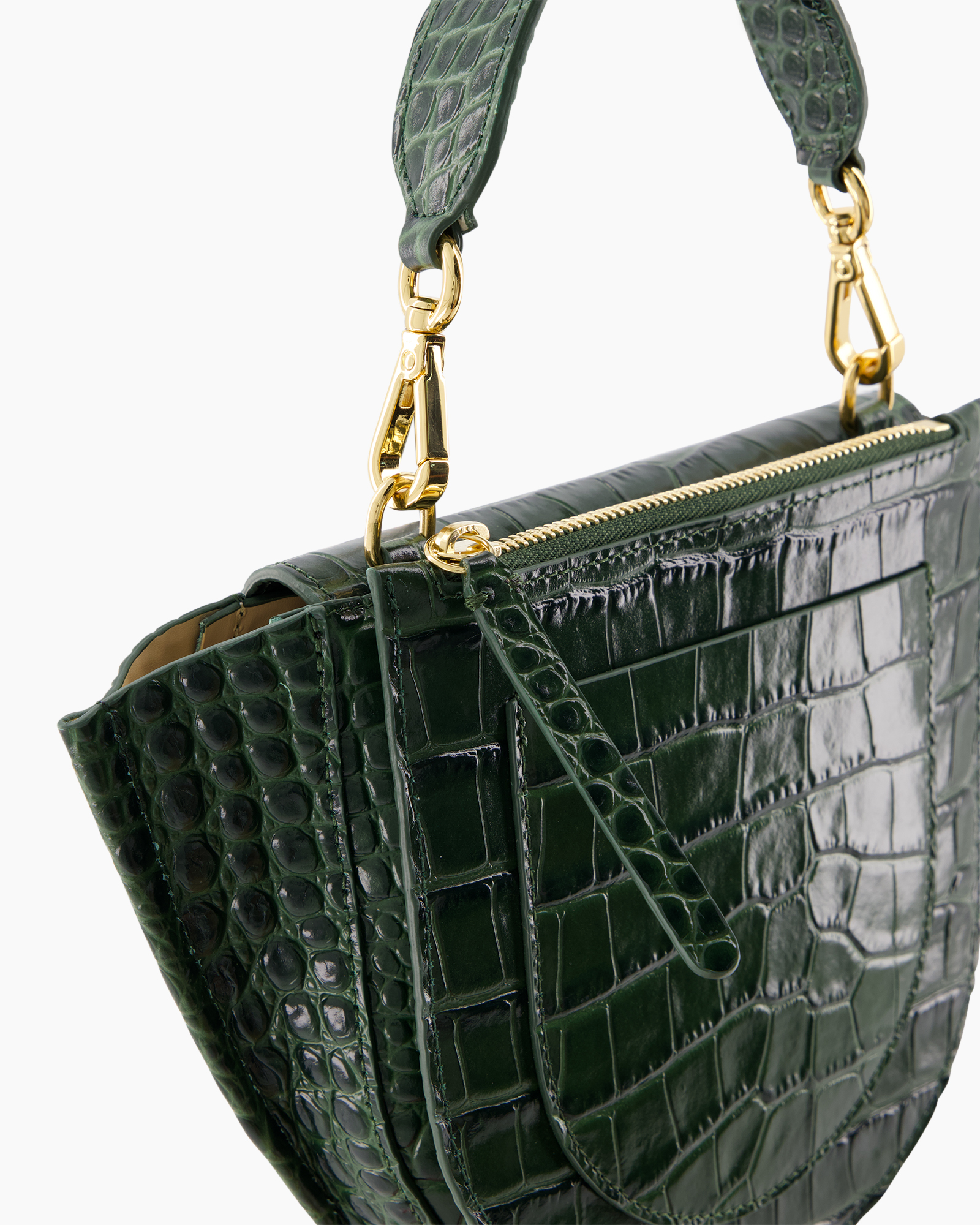 Crossbody Tas Hortensia Mini Groen van Wandler geeft jouw outfit een krachtige uitstraling. Deze tas valt op door de donkergroene kleur en het leer met een krokodillenpatroon. Je draagt het item aan het handvat of gebruikt de riem om de schouder. De rits aan de bovenkant en de goudkleurige details maken het ontwerp compleet.
