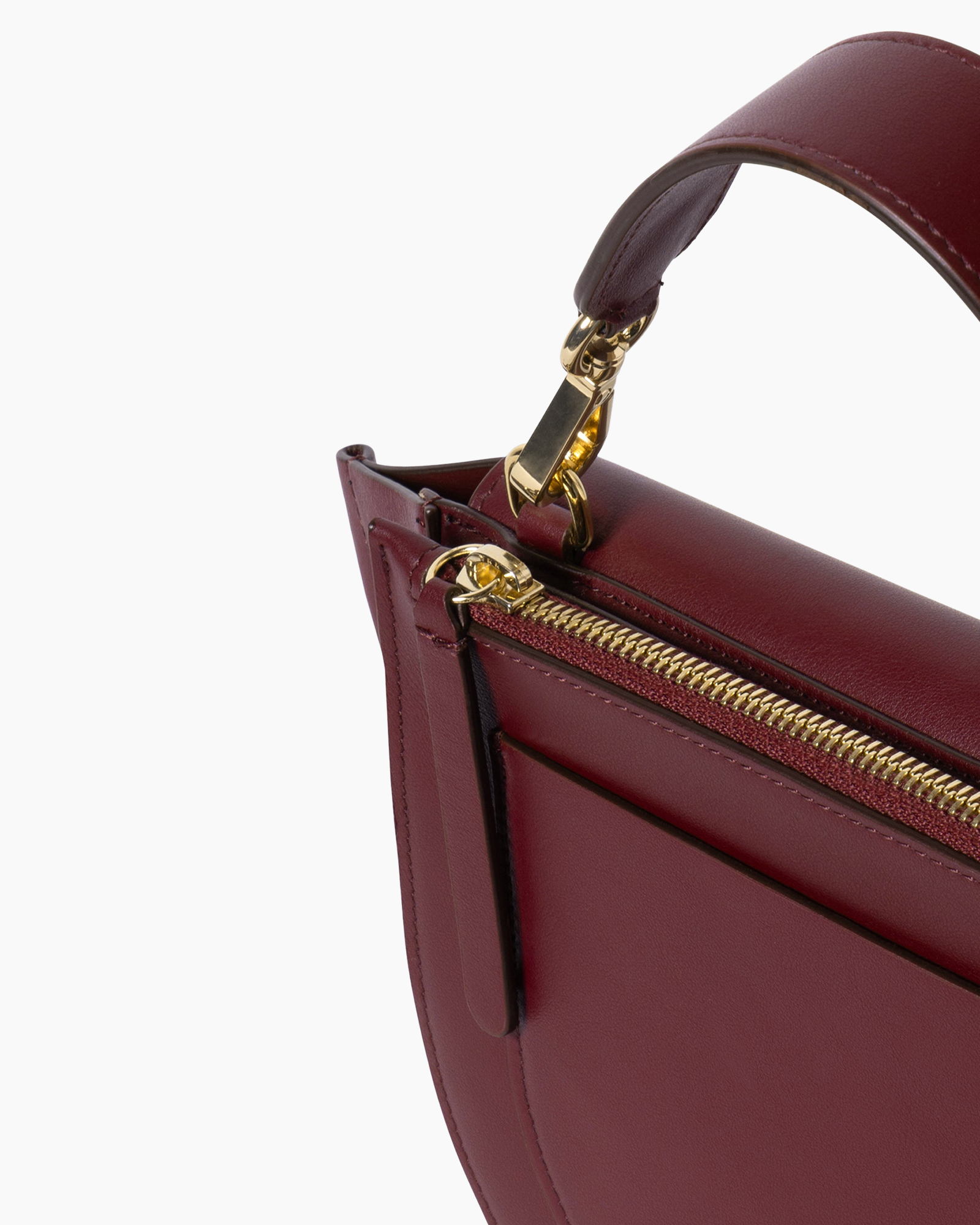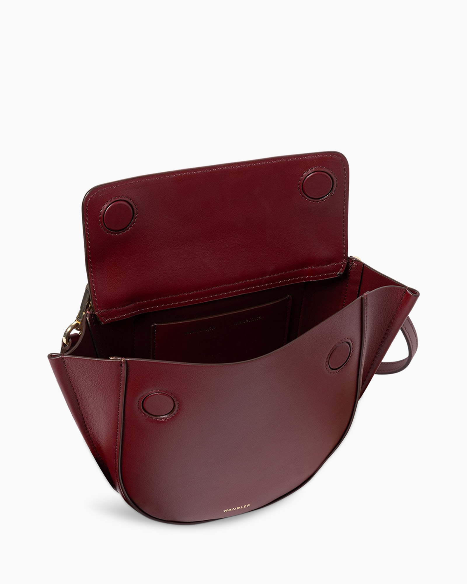 Crossbody Tas Hortensia Mini Rood van Wandler geeft je outfit een krachtige uitstraling. Je bergt je spullen op achter de rits en de flap aan de voorzijde. Dit model van leer heeft een handgreep en een riem voor over je schouder. De diepe rode kleur en de unieke vorm maken de tas een bijzonder item.