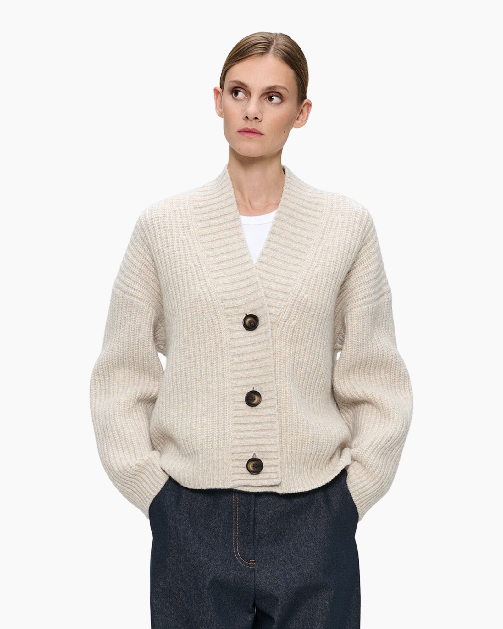 Dit vest is vervaardigd van hoogwaardige wol die een aangename zachtheid biedt. De ontspannen pasvorm maakt het ideaal voor gelaagde looks. De grote knopen en de diepe V-hals zorgen voor een elegant detail.